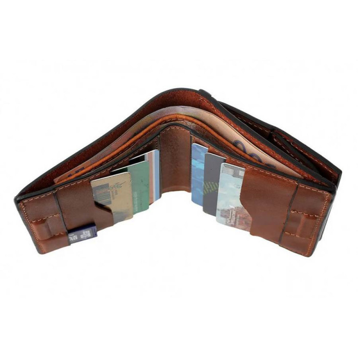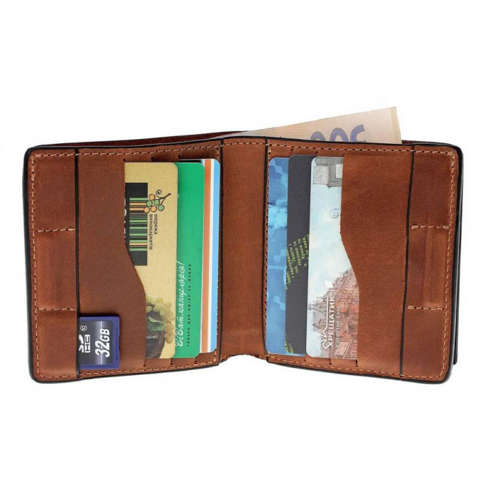 Гаманець для чоловіків та жінок, виконаний з італійської шкіри, має 6 відділень для карток, 2 відділення для купюр, відділення для монет на кнопці зі зворотного боку, застібається на магніт.
