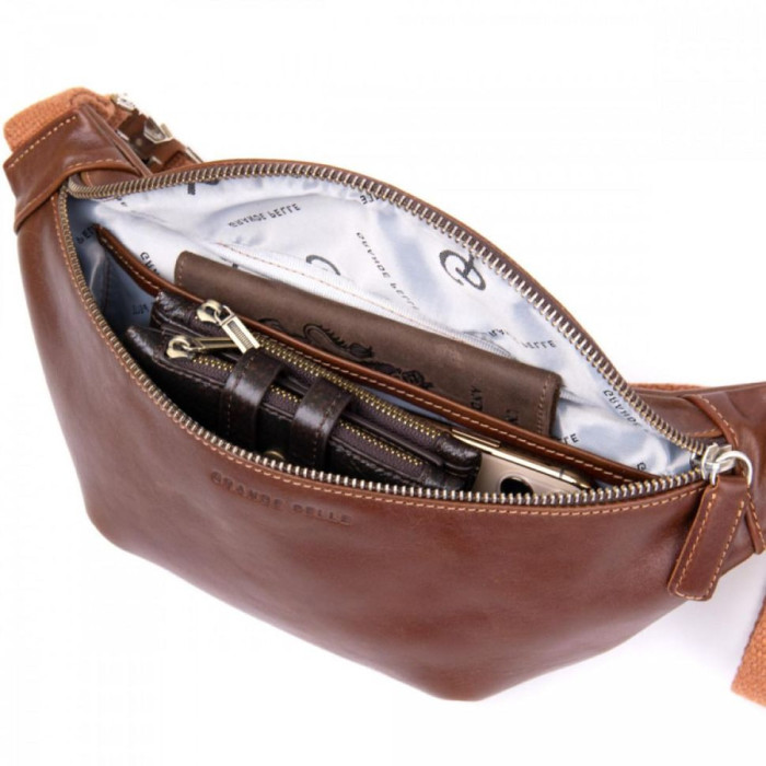 Сумка бананка Grande Pelle 741623 в моді! І це не дивно, адже вона дуже компактна та проста у використанні. Її можна носити на поясі або через плече по діагоналі. Основне відділення закривається на блискавку, всередині є велика кишеня, наприклад для смартфона. І ще залишається місце для портмоне, навушників та окулярів. На обороті передбачена кишеня на блискавці. Матеріалом служить якісна яловича шкіра.