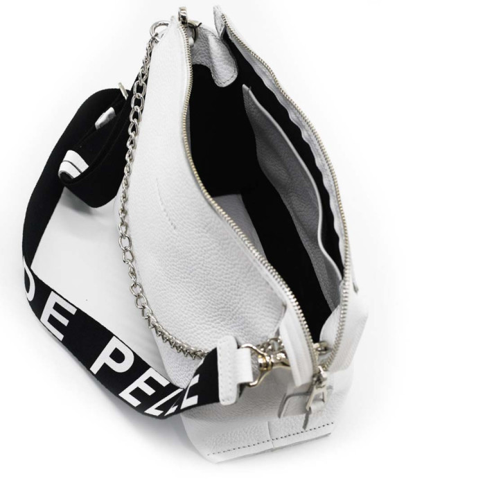 Сумка має стильний текстильний ремінь на плече та ланцюжок. У сумці два ремені.