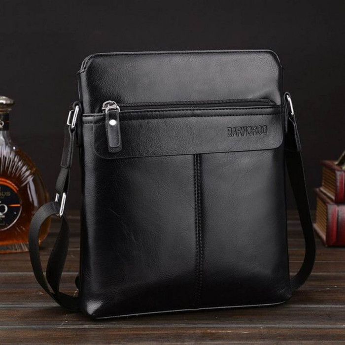 Стильний шкіряний месенджер BARNOROO виконаний в красивому чорному кольорі. Дана модель ідеально підходить для щоденного використання. Аксесуар складається з основного відділення, всередині якого є дві відкриті кишеньки і одна врізна кишеня на блискавці ( під дрібні предмети). Зовні виробу є горизонтальні кишені на блискавці з обох сторін. Що само собою дуже практично. Месенджер виконаний з високоякісної шкіри, має текстильний плечевий ремінь, який регулюється подлине.