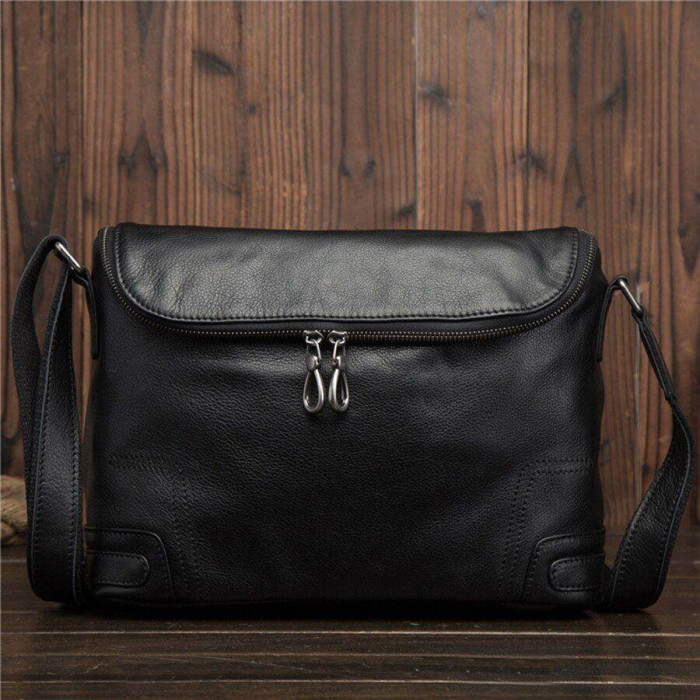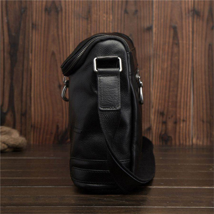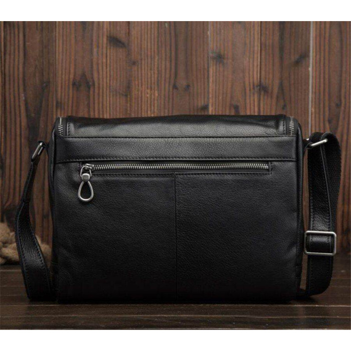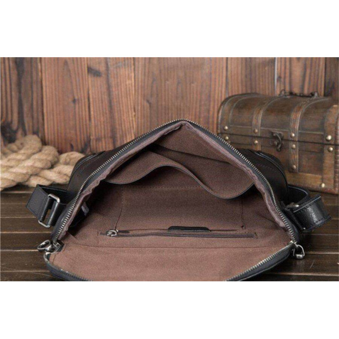 Сумка-месенджер виготовлена з м'якої телячої шкіри, колір чорний. Фактура шкіри має дрібну зернистість. Має одне основне відділення на блискавці, одна кишеня на блискавці і дві додаткові кишені. Текстильний міцний, якісний підкладка. Надійна фурнітура дизайнерської форми. Плечовий ремінь виконаний зі шкіри з текстильної натуральною основою.