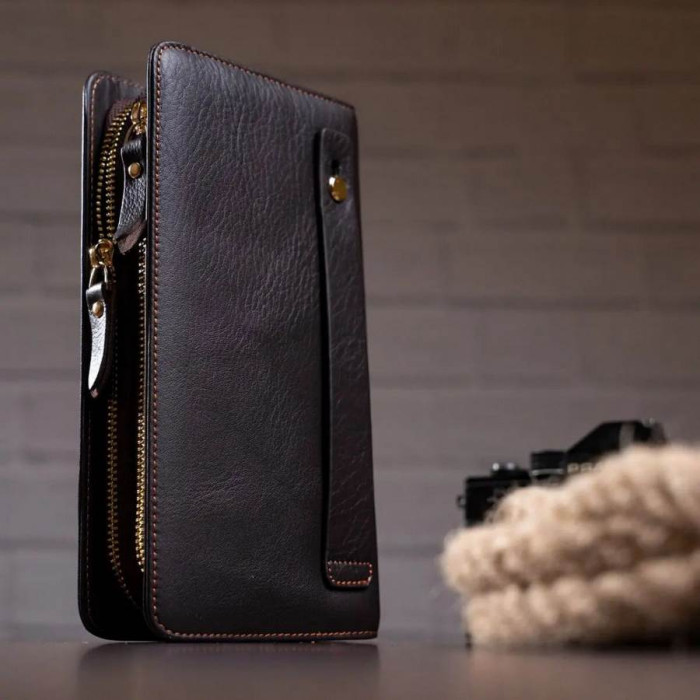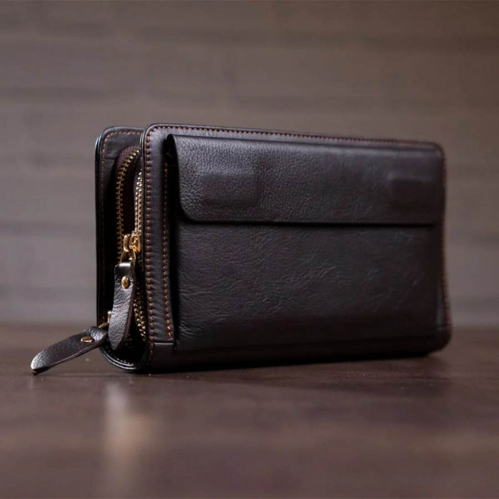 Чоловіча клатч bx9069 в коричневом цвете из натуральной кожи высокого качества. Клатч состоит из двух основных отделений, что закрываются молнией. Стильный аксессуар внутри которого можно разместить банкноты, кредитные карты, монеты и телефон. Универсальный при использовании.