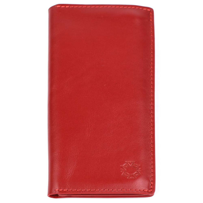 Шкіряний жіночий гаманець лонгер в червоній шкірі Кайзер. Складається з трьох відділень для купюр без додавання: у лівій частині два відділи для купюр, розділені яскравою контрастною перегородкою; у правій частині - один відділ для купюр, монетниця та два відділи для карток. На лицьовій поверхні у правому нижньому кутку фірмовий логотип Carlo Pazolini