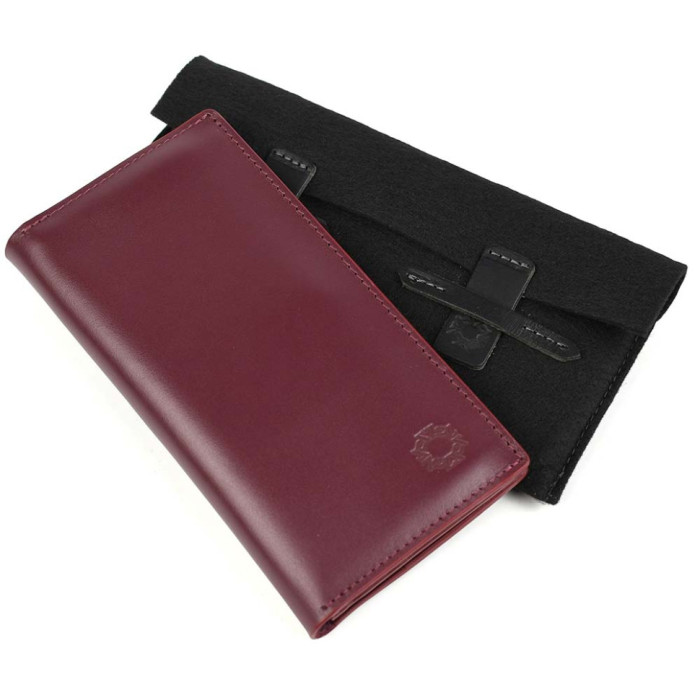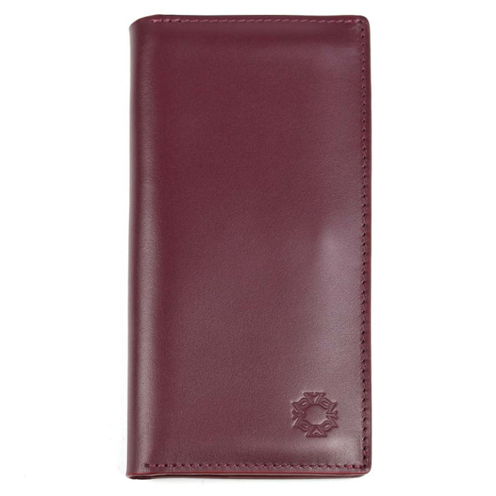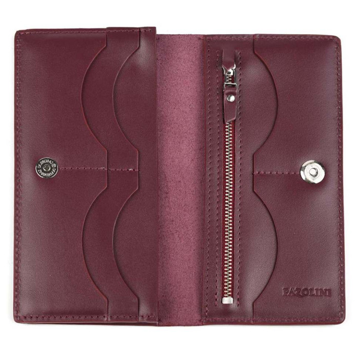Шкіряний жіночий гаманець лонгер у бордовій шкірі Кайзер. Складається з трьох відділень для купюр без додавання: у лівій частині два відділи для купюр, розділені яскравою контрастною перегородкою; у правій частині - один відділ для купюр, монетниця та два відділи для карток. На лицьовій поверхні у правому нижньому кутку фірмовий логотип Carlo Pazolini