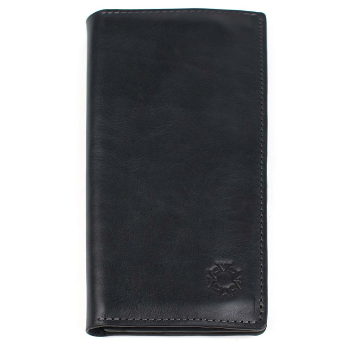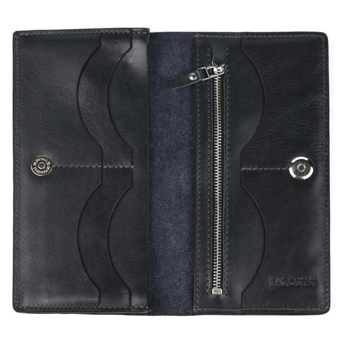 Чоловічий шкіряний гаманець лонгер в Синій Шкіра Сицилія. Складається із трьох відділень для купюр без складання: у лівій частині два відділи для купюр, розділені перегородкою; у правій частині - один відділ для купюр, монетниця та два відділи для карток. На лицьовій поверхні у правому нижньому кутку фірмовий логотип Carlo Pazolini