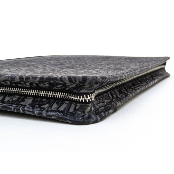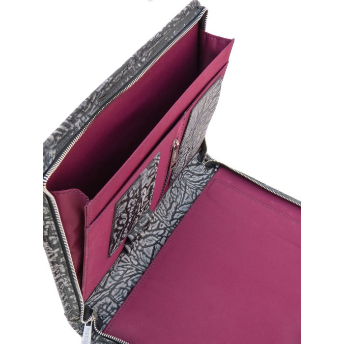 Ексклюзивна шкіряна папка A4 skin - elephant TARWA CrG-1404-4lx. Папки виконані з сірої шкіри слона з природною текстурою і переливом кольору за текстурою. Папка закривається застібкою-блискавкою з усіх боків, передбачена висувна ручка для носіння. На лицьовій стороні є зовнішня кишеня для швидкого доступу. Усередині він дублюється з точно такою ж натуральною шкірою і насиченим кольором бордової текстильної підкладки.