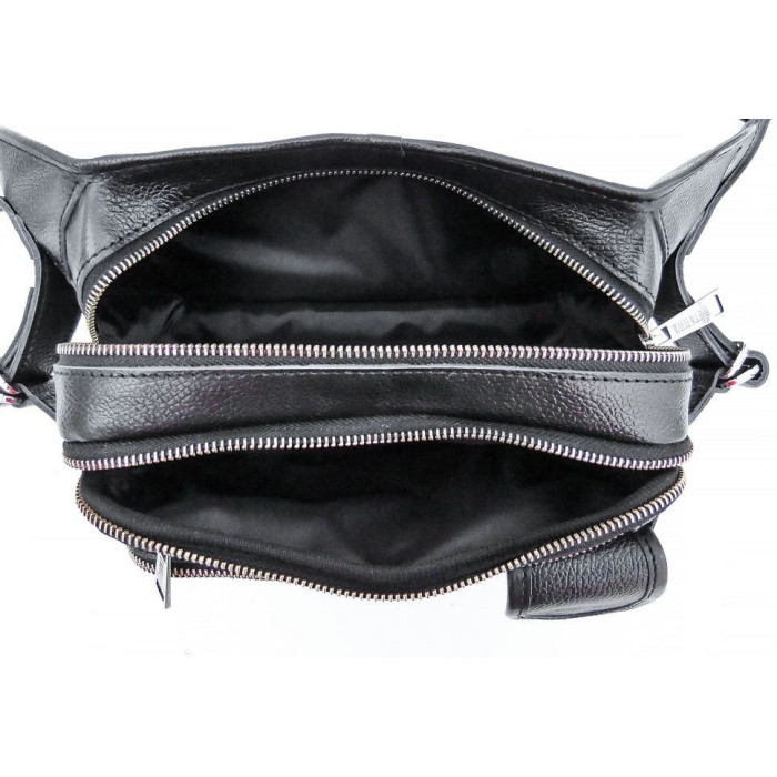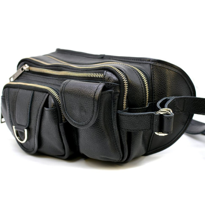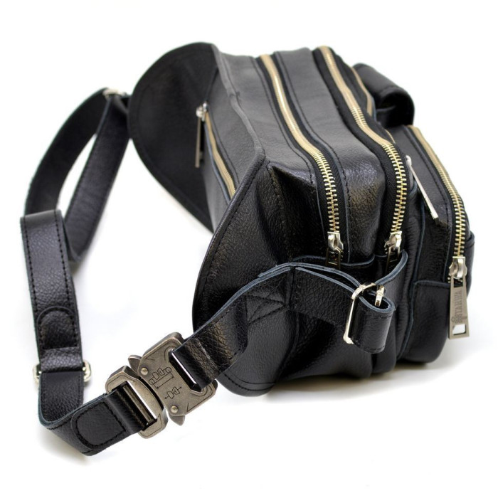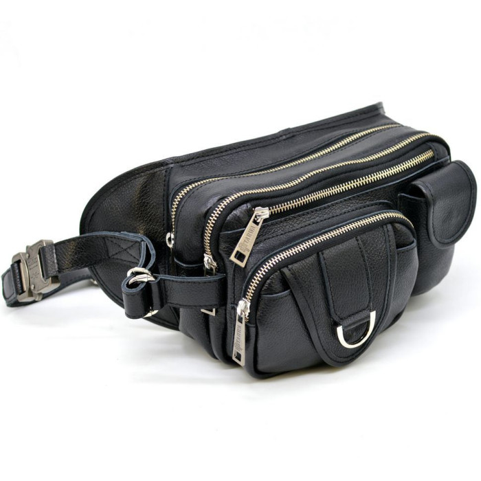 Найбільш містка сумка напоясна з телячої шкіри FA-1560-3md бренду TARWA. Підходить для повсякденного носіння, далеких поїздок, відряджень. Велика кількість надійних кишень можуть зацікавити людей з великою кількістю речей, що постійно носяться. Темна блискавка. Виготовлена із зернистої шкіри флотар чорного кольору. Має чотири ізольовані секції на металевих блискавках, три з них на лицьовій видимій стороні та одна на тильній стороні (секретна секція). З лицьової частини сумки прикрашають дві накладні кишені - одну на блискавці, другу з клапаном на магнітній кнопці. Шкіряний ремінь виготовлений повністю зі шкіри, з широким регулюванням обхвату. Є бічні ремені, що регулюють об'єм аксесуара. Металева фурнітура у темному кольорі нікель. Підкладка із міцного текстилю.