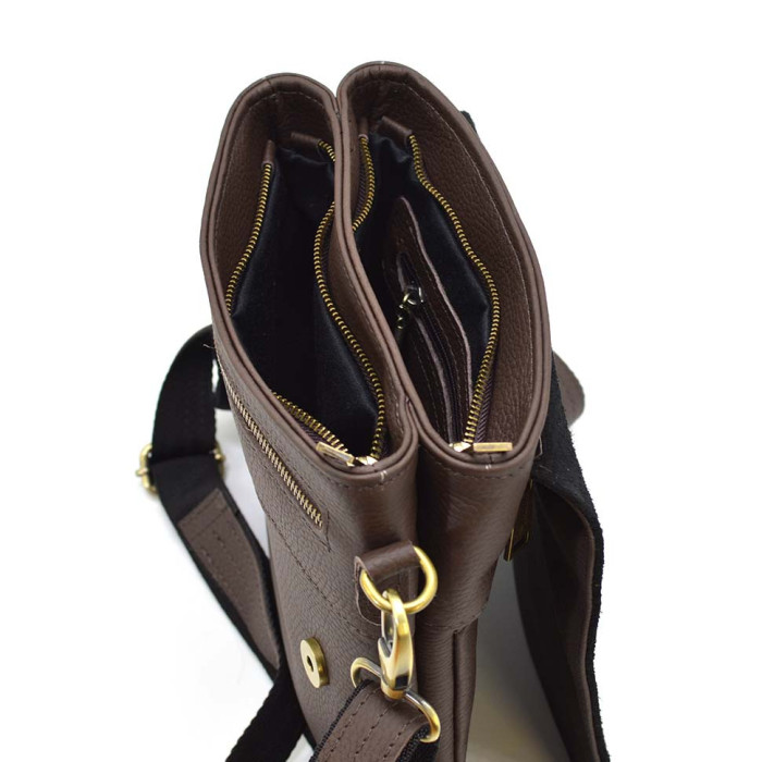 Чоловіча сумка через плече FC-0022-4lx TARWA на 2 відділення від українського бренду TARWA на два відділення з клапаном, натуральна шкіра Флотар. Модель може вміщувати документи формату А5 та планшет. Виріб виготовлений із натуральної м'якої телячої шкіри. Сумка складається із двох відділень, що застібаються за допомогою шкіряного клапана, з магнітними кнопками. Усередині є врізна і відкрита кишені в одному відділенні, і ще одна відкрита ховається під клапаном. На задній стороні є врізна кишеня на блискавці. Аксесуар зручно носити на плечі завдяки плечовому ременю з регулюванням довжини.