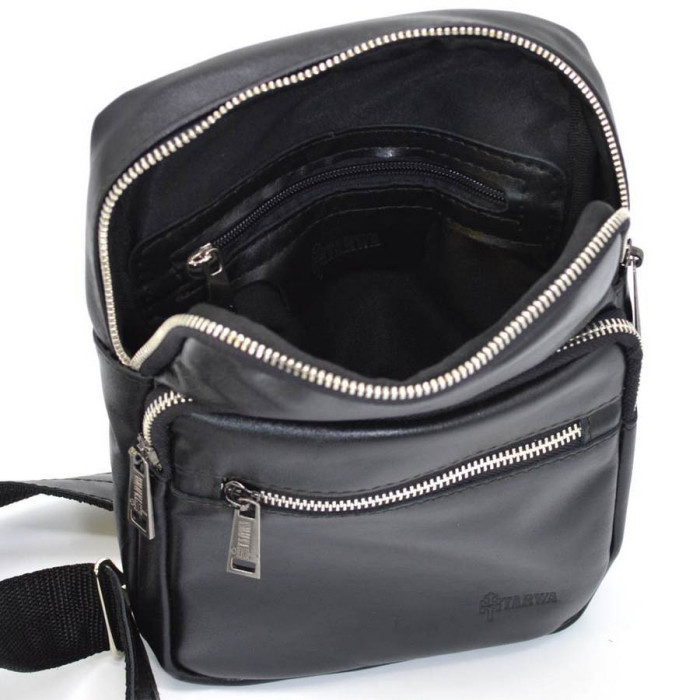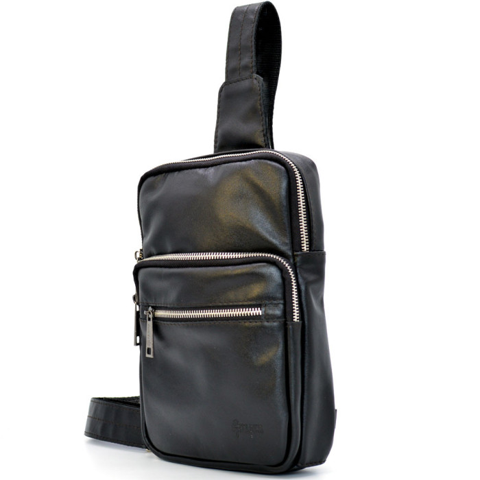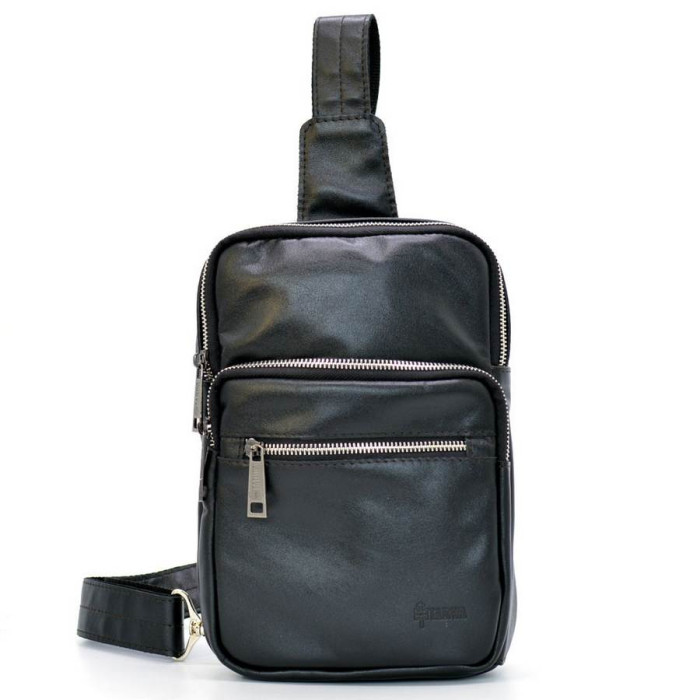 Шкіряний рюкзак чоловічий слінг на одну шлейку GA-0904-4lx TARWA з натуральної гладкої телячої шкіри. Зручний та корисний аксесуар призначений як для щоденного використання, так і для поїздок, коли потрібно тримати документи, гроші та квитки під рукою. Вміщує документи формату А5. Виріб на одне відділення з міцним тканинним підкладом. Усередині є врізна кишеня з блискавкою для документів або інших важливих дрібних речей. На лицьовій стороні рюкзачка розташовується об'ємна кишеня на блискавці, а на ньому ще одна горизонтальна врізна. На задній стороні сумки також є врізна кишеня. Аксесуар оснащений шкіряною шлейкою з текстильною основою, що запобігатиме її деформації. Ремінь регулюється по довжині і перестібається на право/ліво, завдяки чому Ви зможете вибирати на який бік носити виріб.
