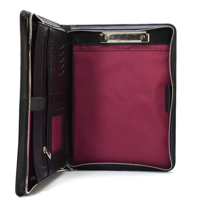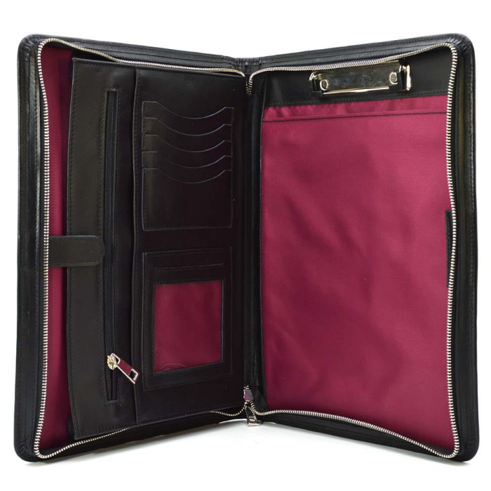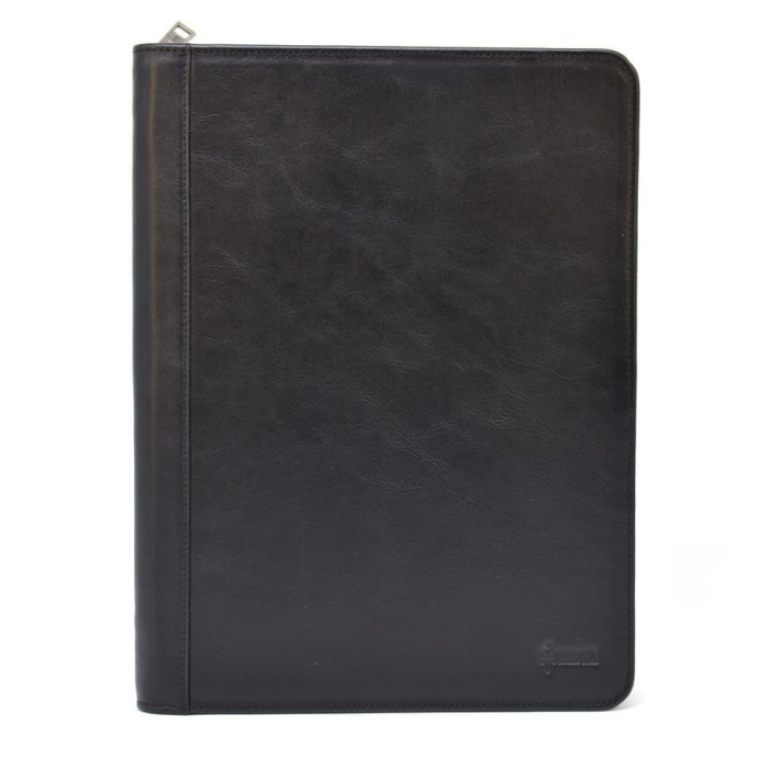 Шкіряна папка на блискавці формат А4 TARWA GA-1297-4lx із затискачем для паперу Шкіряна папка на блискавці для документів А4+GA-1297-4lxвід українського виробника TARWA, у чорному кольорі. Папка вміщує документи А4 в два спеціальних відсіки для паперів А4, один з яких дуже місткий і застібається на хлястик з кнопкою, також документи можна вміщати просто "всередину" папки, що закривається. Дана модель має: 5 слотів для пластикових карток, виготовлена папка з високоякісної шкіри, всередині папки якісний текстильний підклад у бордовому кольорі. Стильний аксесуар ідеально підійде для роботи в офісі, відрядження. На правій стороні є верхній затискач для паперів та документів.
