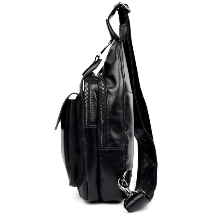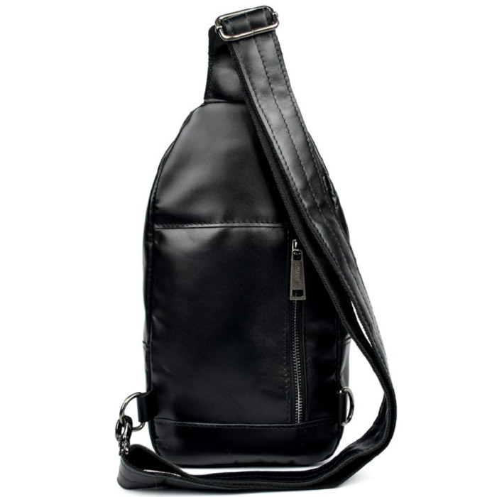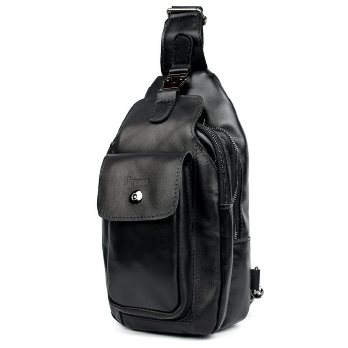 Модний рюкзак на моношлейці із натуральної телячої шкіри TARWA GA-4007-3md виготовлений з високоякісної натуральної телячої шкіри класичного чорного кольору з оригінальною фактурою на дотик.