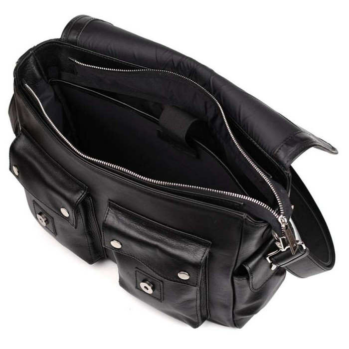 Також, усередині, на іншій стінці є дві відкриті кишені для телефону та портмоне, і ще одна на блискавці. На задній стороні сумки є кріплення для ременя. Лицьову сторону аксесуара прикрашають дві об'ємні кишені, прикриті шкіряним клапаном з ремінцями на магнітах та логотипом бренду. Торцеві сторони виробу оснащені двома кишенями із клапанами зі шкіри, що надають сумці особливий шарм.