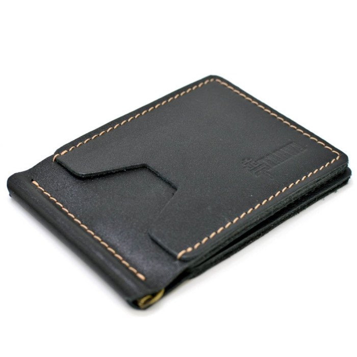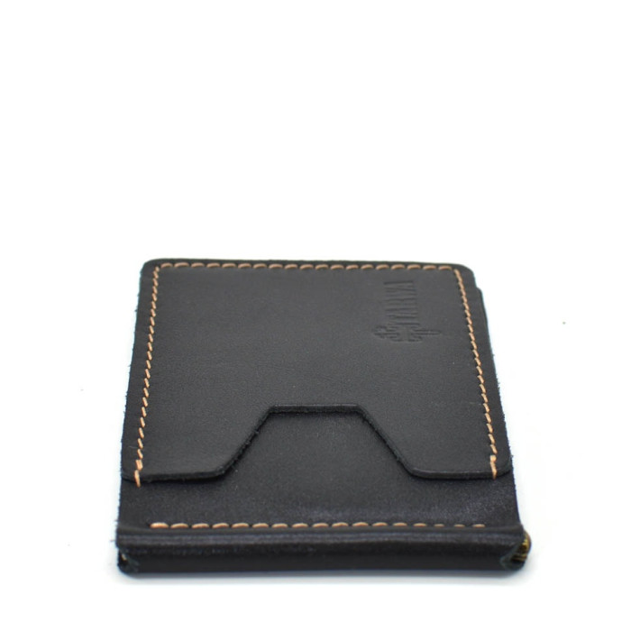 Шкіряний затискач для грошей м'який чорний GAw-hold-001 TARWA. Аксесуар виготовлений з натуральної шкіри наппа чорного кольору, ручної роботи зі світлим рядком (ниткою). Чотири слоти під банківські картки (два всередині, два зовні), гак на пружині для фіксації купюр. Товста та міцна нитка. М'яка шкіра. У даній моделі затиску TARWA всередині є гачок-затискач для купюр та 4 відділення для карток. Розмір затиску дозволяє легко поміститися в кишеню. Розмір 11.5 див на 8 див.