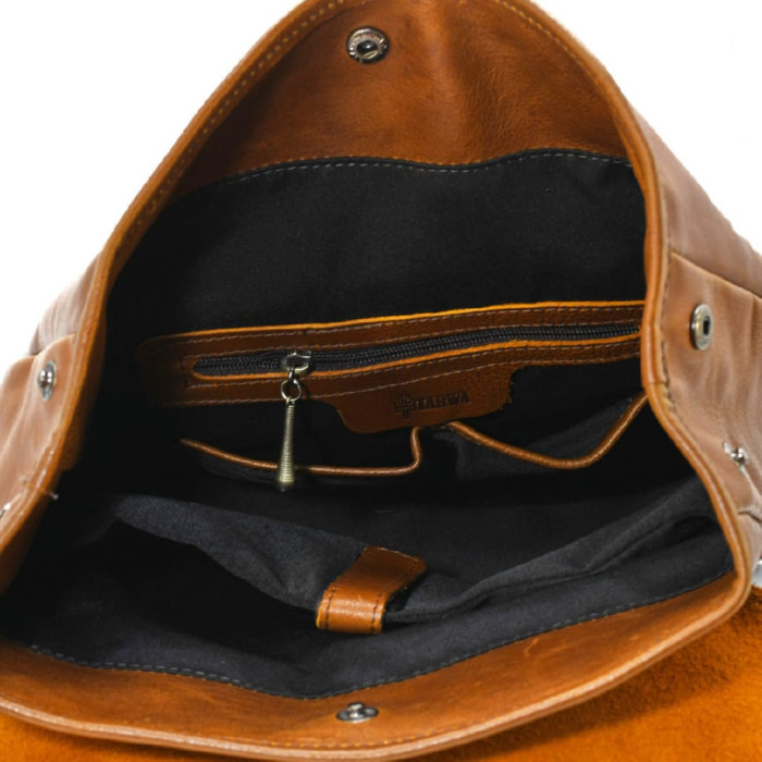 Усередині: дві накладні кишені для телефону та портмоне та містка кишеня з блискавкою. На спинці рюкзака є ще одна кишеня з блискавкою. Сам виріб застібається на блискавку і зверху накривається шкіряним клапаном з ремінцями на магнітних кнопках.
