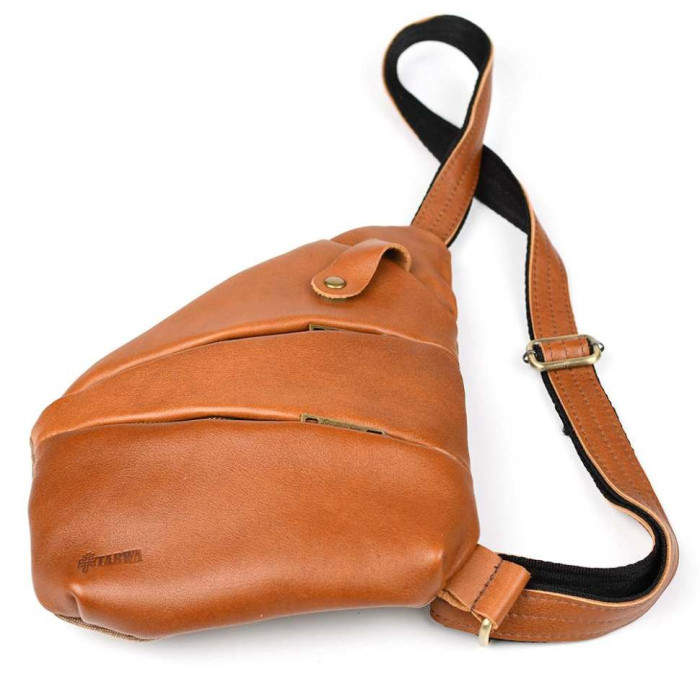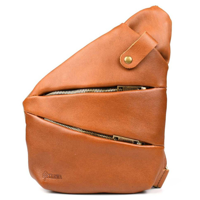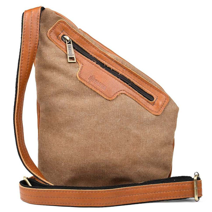 Чоловіча сумка-слінг через плече із поєднання канвасу та натуральної шкіри від українського бренду Tarwa. Задня частина сумки повністю тканинна, а лицьова сторона та ремінь навпаки вся зі шкіри. Виріб відрізняється оригінальним дизайном та максимальною функціональністю при носінні. Буде корисна у поїздках та подорожах. Складається з одного місткого відділення, що застібається на блискавку. На лицьовій стороні сумки розташовані дві горизонтальні кишені, що закриваються на блискавці, також зверху є маленька кишенька з хлястиком на кнопці. Ремінь (шлейка) двокомпонентний - складається зі шкіри та текстильної стропи для надання міцності та довговічності виробу. Ремінь регулюється за довжиною. Вся фурнітура та блискавки металеві.