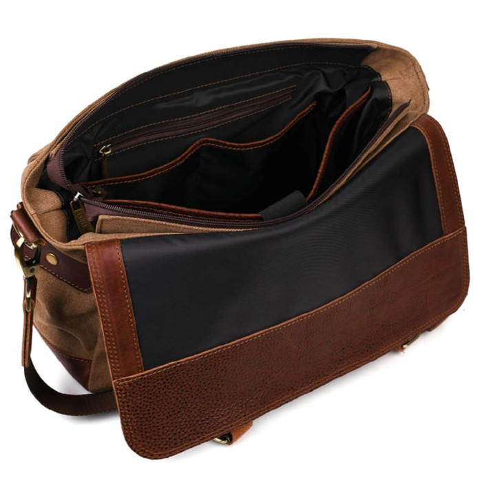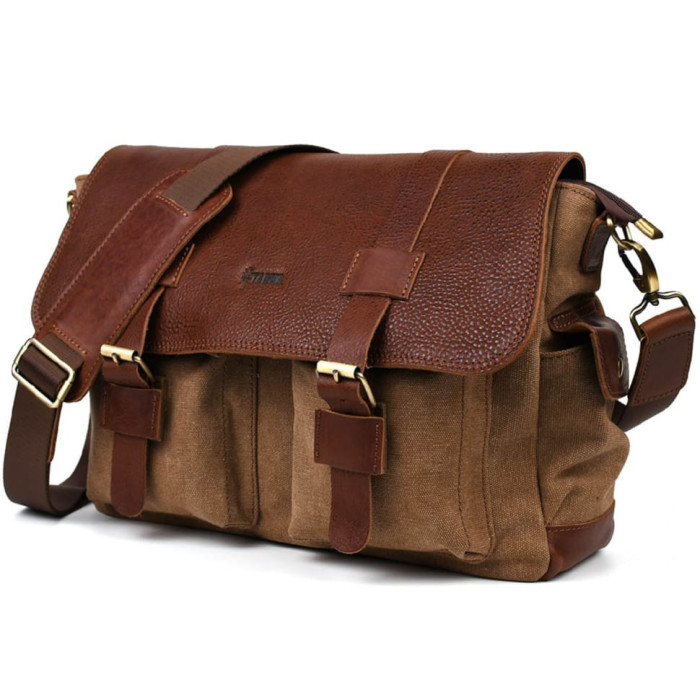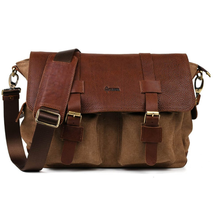 Від українського бренду TARWA. Стильний аксесуар для чоловіків Виріб має одне основне відділення, всередині якого є додатковий відсік для ноутбука або планшета. Вміщує формат А4. Також, є дві додаткові кишені, і ще одна на блискавці. На задній стороні сумки є кріплення для ременя. На лицьовій стороні також є дві кишені, прикритих шкіряним клапаном. Торцеві сторони виробу оснащені двома кишенями із клапанами. Універсальна сумка, яка підійде як для повсякденного використання, так і для поїздки.