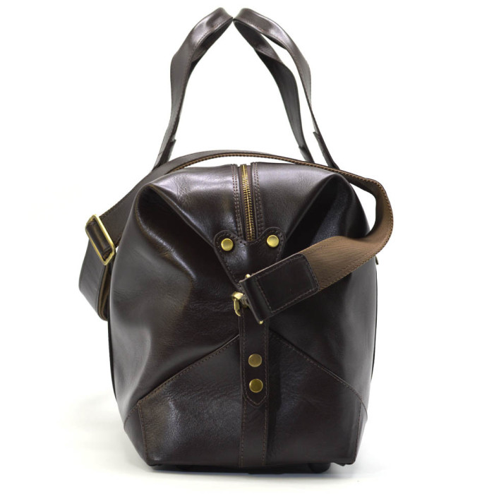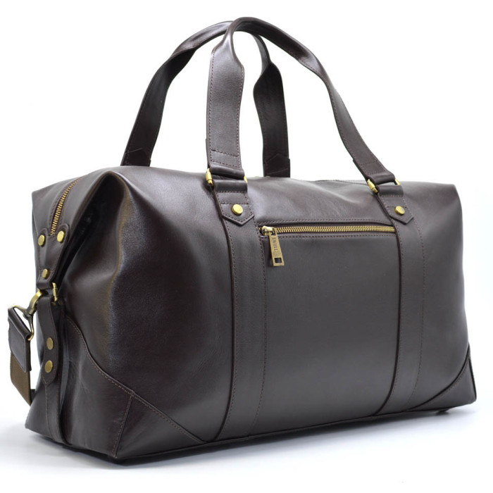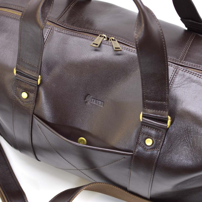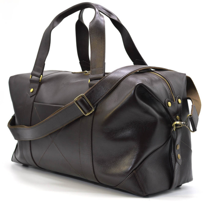 Шкіряна дорожня спортивна сумка (Баул) TARWA GC-0320-4lx із подовженими ручками для носіння на плечі. Наплічний шкіряний ремінь у комплекті. Усередині тканинна підкладка та безліч відкритих кишень та кишеню на молії на всю ширину. Ручки шкіряні на двох металевих шарнірах-рамках щільно прошиті до сумки та продубльовані у навантажених місцях металевими заклепками.