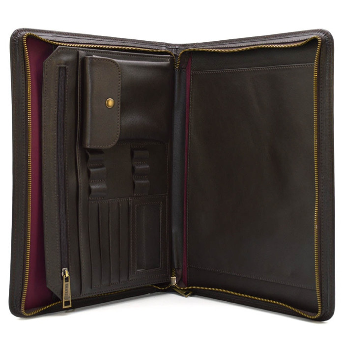 Усередині: три великі відділення-кишені для паперів формату А4, одна врізна кишеня з блискавкою вміщує А5+, п'ять слотів-кишеньок під пластикові картки або візитки, одна шкіряна, що закривається клапаном на кнопці кишеню для дрібних предметів, а також три тримачі для ручок. Завдяки тому, що папка закривається на блискавку, можна зберігати документи всередині папки, а не тільки в кишенях. Папка всередині в основному обшита шкірою та трохи тканинним підкладом. На лицьовій стороні, в правому нижньому кутку аксесуара розміщується тиснення з логотипом виробника.