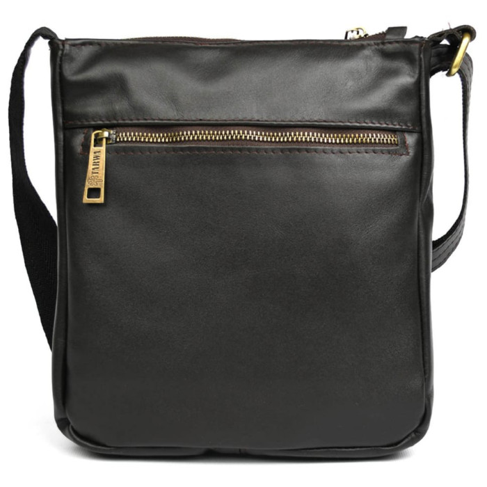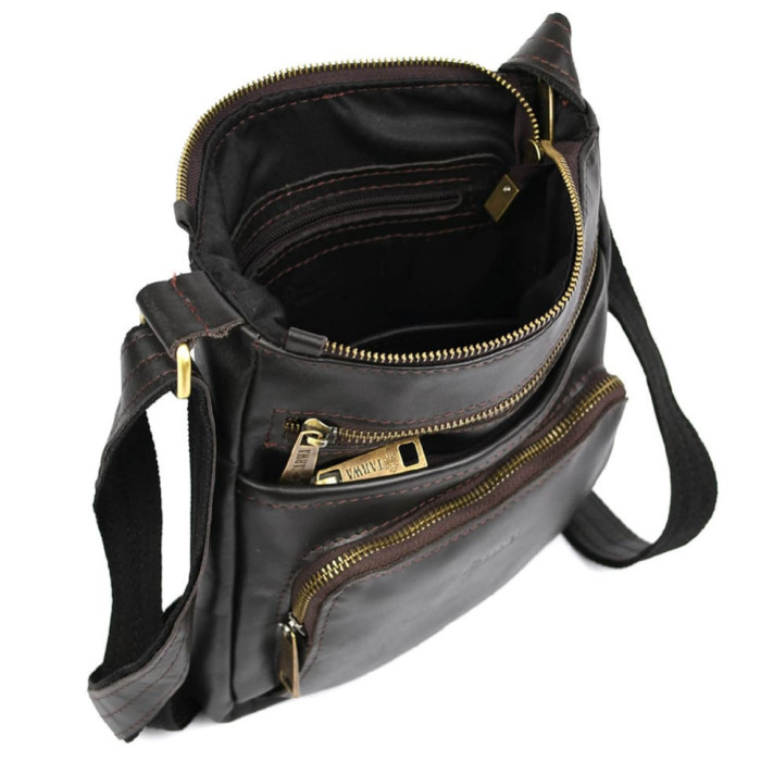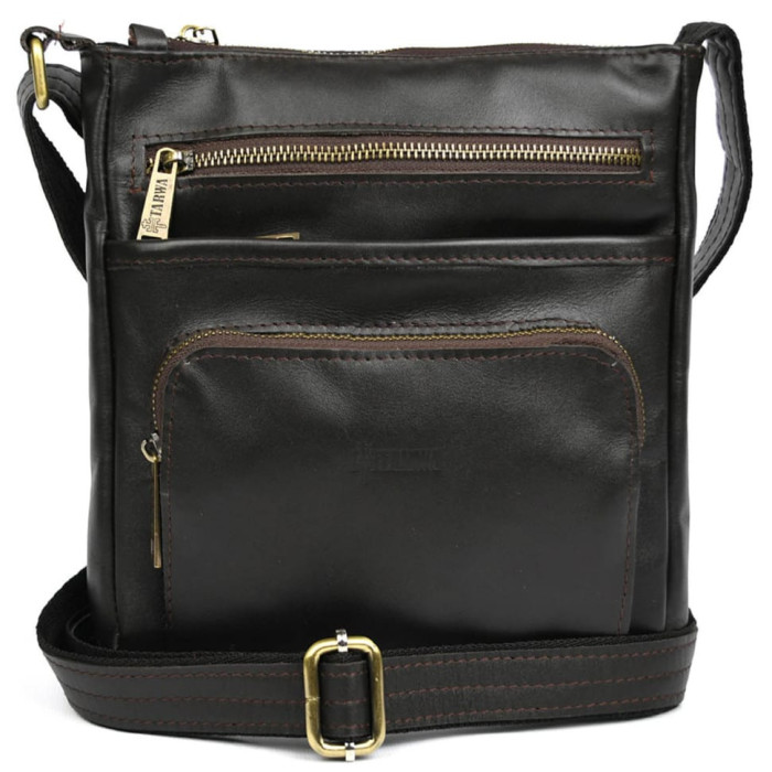 Чоловіча сумка через плече з натуральної телячої шкіри GC-1303-3md від українського бренду TARWA. Виріб на одне відділення, яке застібається на блискавку. Може вміщати планшет. Усередині є кишені для дрібних особистих речей: дві відкриті накладні і одна врізна на блискавці. На обох зовнішніх сторонах аксесуара розташовуються кишені на блискавці. У виробі використано міцну тканинну підкладку. Сумочку можна носити на плечі завдяки зручному плечовому шкіряному ременю, що регулюється.