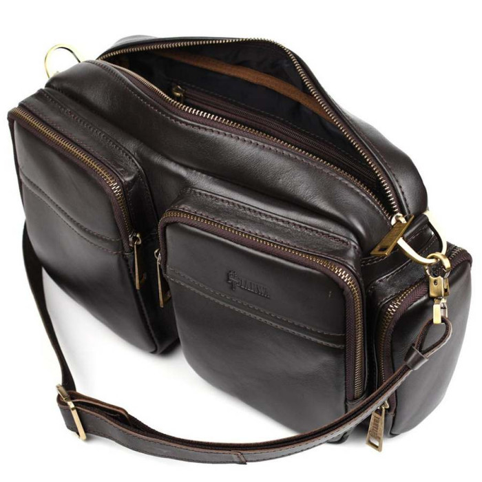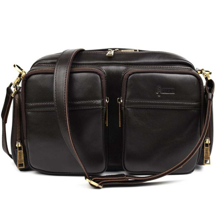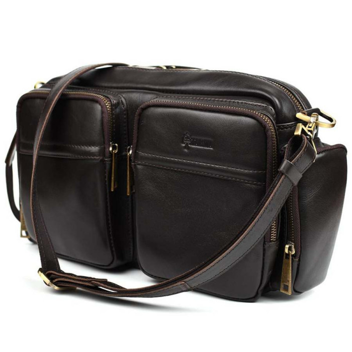 Сумка зі шкіряним знімним ремінцем для зручності носіння. Для виготовлення сумки виробник використовував якісні матеріали: шкіра теляча, текстильний підклад всередині, брендована фурнітура. На одній із зовнішніх шкіряних вставок також є логотип виробника TARWA.