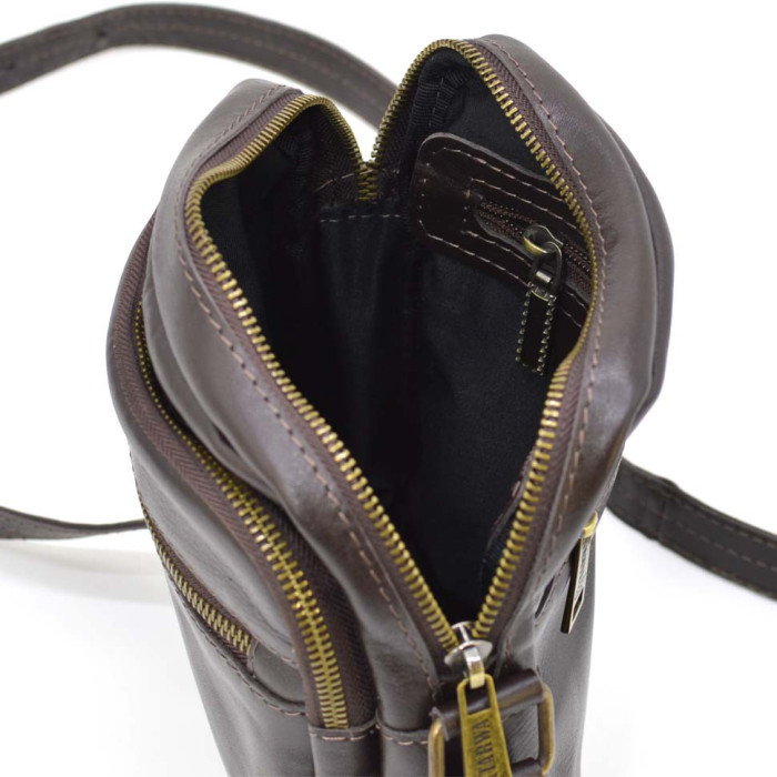 Чоловіча шкіряна сумка через коричневе плече GC-8086-3md від українського бренду TARWA. Маленька, але містка сумочка, в якій Ви з легкістю зможете розмістити свої необхідні речі. Виріб на одне відділення, з внутрішньою кишенею врізною з блискавкою. На лицьовій стороні є дві кишені з блискавками, а також на тильній стороні одна кишеня. Аксесуар оснащений шкіряним регульованим двостороннім ременем.