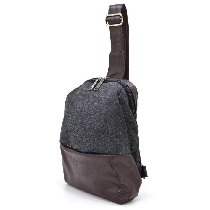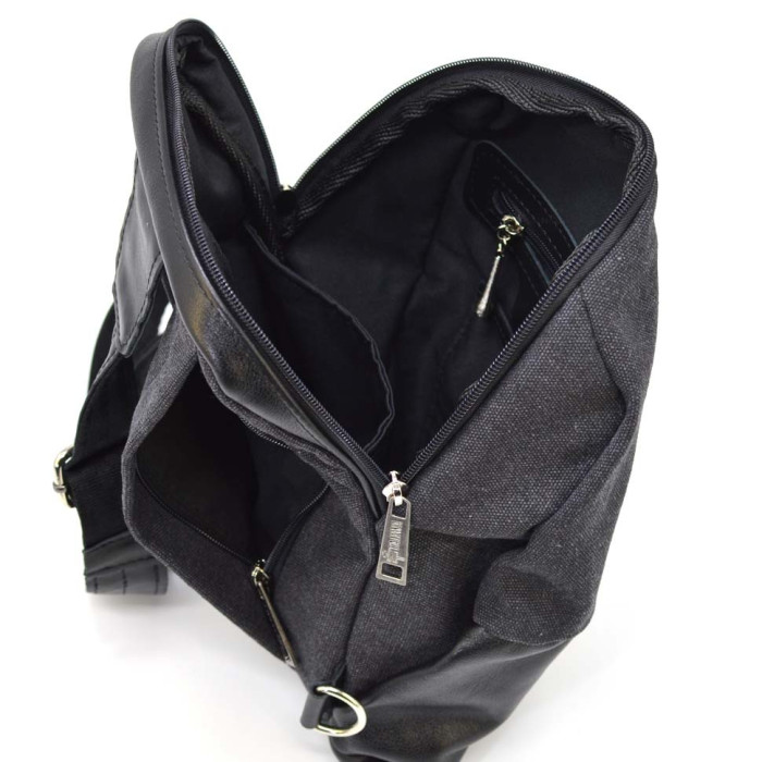 Рюкзак слінг на одне плече зі шкіри та канвас TARWA GCa-1905-3md. Шлейка перестібається під шульгу або правшу за 2 секунди шляхом клацання карабіна. М'яка форма виробу, що підлаштовується під вміст і ваші потреби. Цікаве поєднання натуральної чорної шкіри Наппа та канвас кольору глибокий синій.