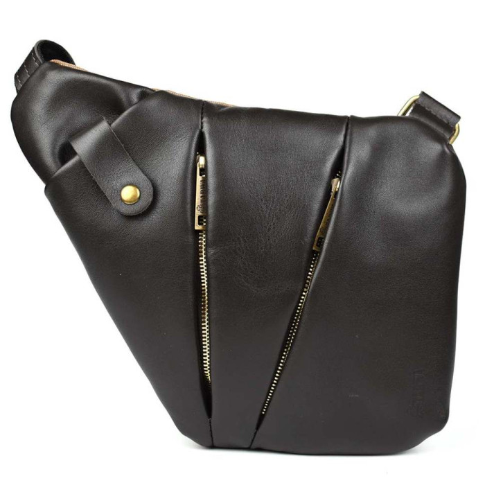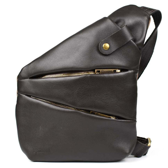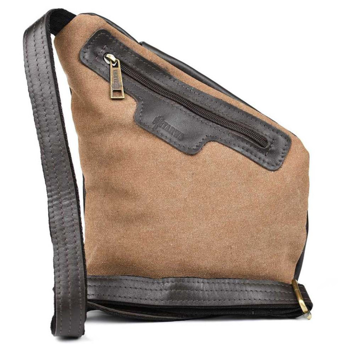 Чоловіча сумка-слінг через плече із поєднання канвасу та натуральної шкіри від українського бренду Tarwa. Задня частина сумки повністю тканинна, а лицьова сторона та ремінь навпаки вся зі шкіри. Виріб відрізняється оригінальним дизайном та максимальною функціональністю при носінні. Буде корисна у поїздках та подорожах. Складається з одного місткого відділення, що застібається на блискавку. На лицьовій стороні сумки розташовані дві горизонтальні кишені, що закриваються на блискавці, також зверху є маленька кишенька з хлястиком на кнопці. Ремінь (шлейка) двокомпонентний - складається зі шкіри та текстильної стропи для надання міцності та довговічності виробу. Ремінь регулюється за довжиною. Вся фурнітура та блискавки металеві.