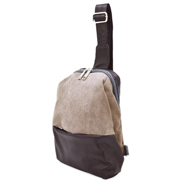 Рюкзак слінг на одне плече зі шкіри та канвас TARWA GCs-1905-3md. Шлейка перестібається під шульгу або правшу за 2 секунди шляхом клацання карабіна. М'яка форма виробу, що підлаштовується під вміст і ваші потреби. Цікаве поєднання натуральної коричневої шкіри наппа та канвас кольору пісок