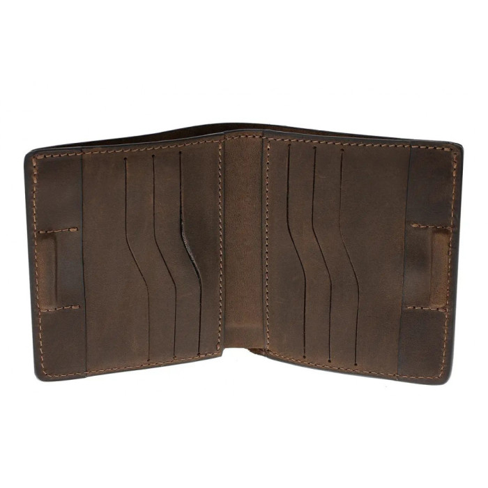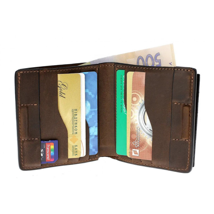 Гаманець для чоловіків та жінок, виконаний з італійської шкіри, має 6 відділень для карток, 2 відділення для купюр, відділення для монет на кнопці зі зворотного боку, застібається на магніт.