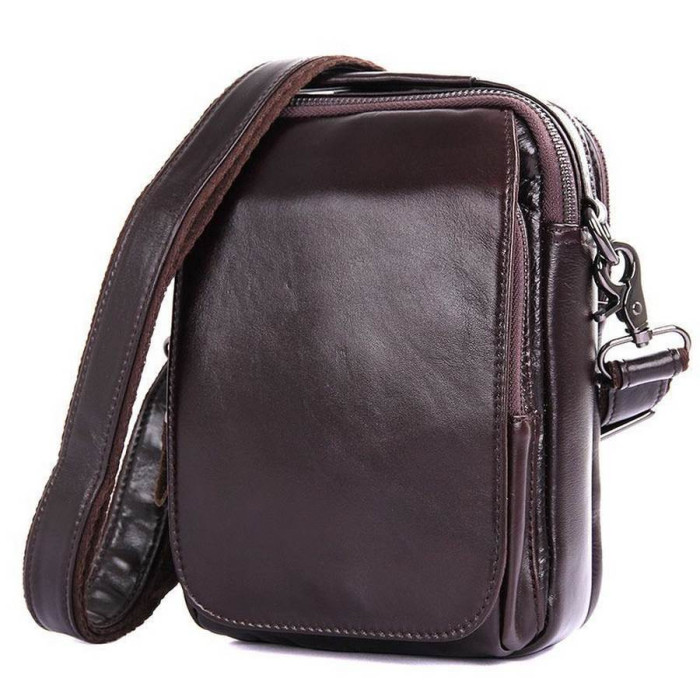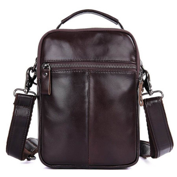 Маленька чоловіча сумочка John McDee, з ручкою і знімним ремінцем через плече, з натуральної телячої шкіри. Виріб виконаний з якісних матеріалів, з використанням металевої фурнітури. У сумочки два основних відділення на блискавках, в одному з яких є маленька кишенька. На передній стороні даного аксесуара є виступаючий кишеню з блискавкою, і до того ж зверху він закривається ще і клапаном з магнітом. На задній стороні сумки знаходиться ще один врізна кишеня на блискавки. Функціональне наповнення сумки дозволить розмістити в ній необхідні щодня предмети, незважаючи на компактність.