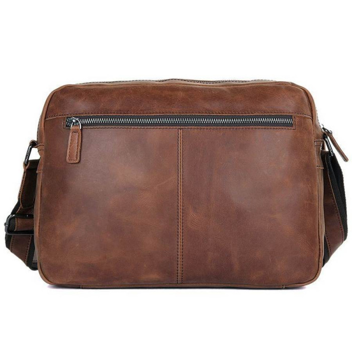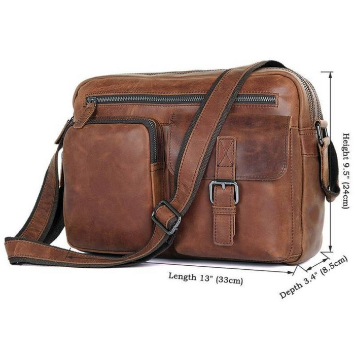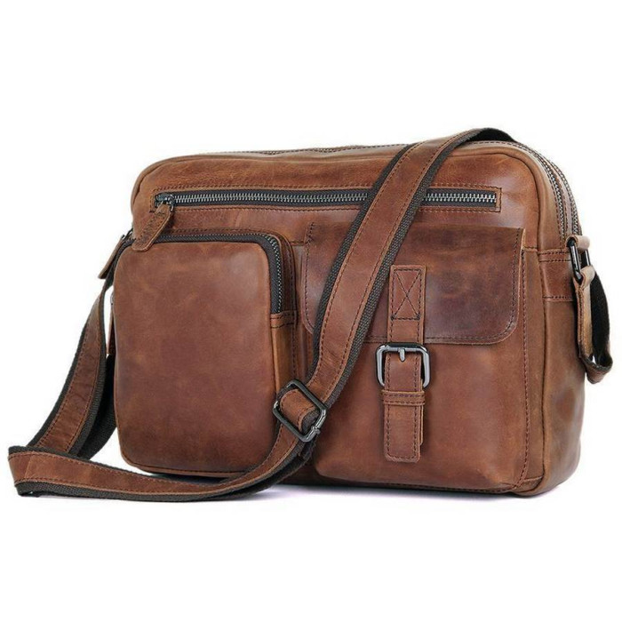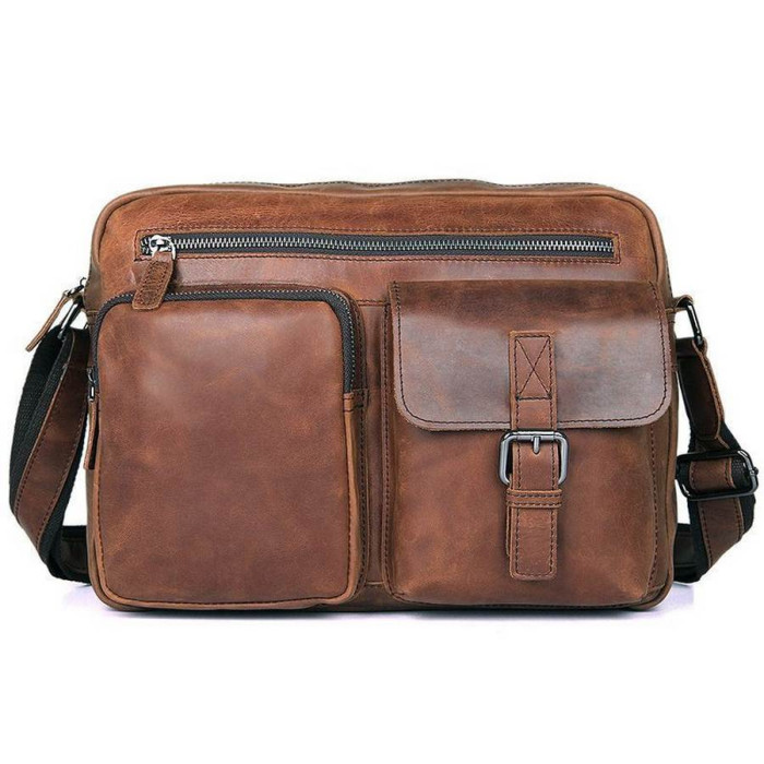 Дуже містка (вміщує формат А4 горизонтально), стильна чоловіча світло-коричнева сумка з кінської шкіри, бренду John McDee. Сумка складається з двох великих відділень і ще одного поменше, кожне з яких застібається блискавкою. Також всередині є кишені для всякої дрібниці - два накладних відкритих і один на замочку. Лицьова сторона вироби оформлена досить стильно, за допомогою двох великих виступаючих кишень, які привертають до себе увагу в першу чергу. Причому, цікаво те, що один кишеню застібається на блискавку, а другий закривається клапаном з магнітною кнопкою. Ну і звичайно ж, є кишеня з блискавкою на задній стороні сумки. Шкіряний ремінець, цього цікавого аксесуара, укріплений текстильної основою.