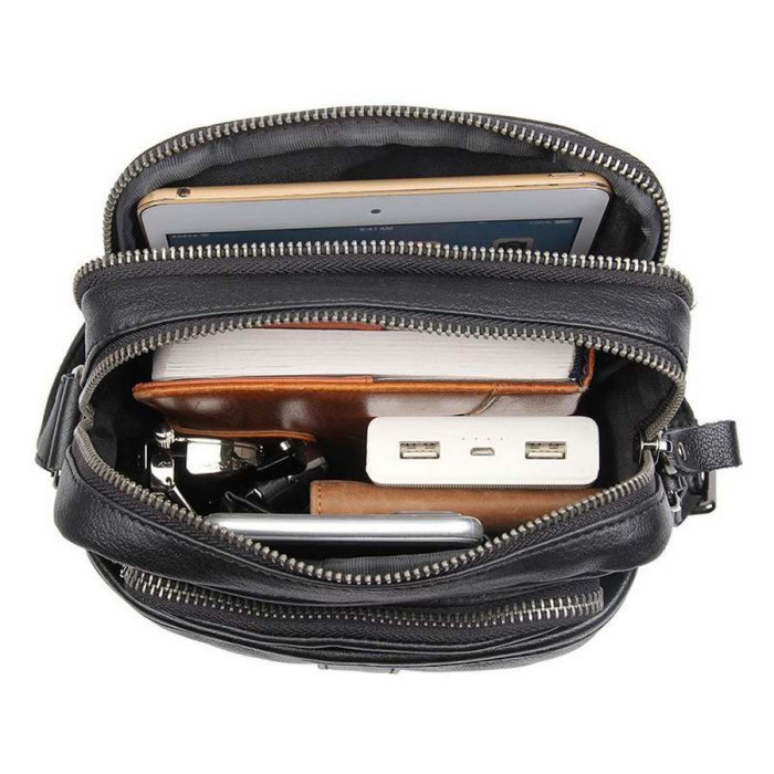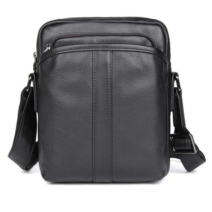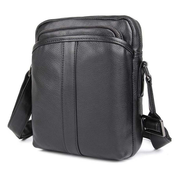 Чоловічі шкіряні сумки месенджер на плече чорна John McDee 1054A. Модель виконана з натуральної шкіри. Модель може вміщувати формат А5. Виріб на два відділення, що застібаються кожне на окрему блискавку. Усередині сумка має дві кишені: одна врізна з блискавкою, друга - відкрита, для смартфона або портмоне. На лицьовій стороні розташовуються дві кишені: одна накладна з блискавкою і відкрита на магнітній кнопці. На задній стороні також є врізна кишеня з блискавкою. Аксесуар оснащений плечовим шкіряним ремінцем на плече, з регулюванням довжини.