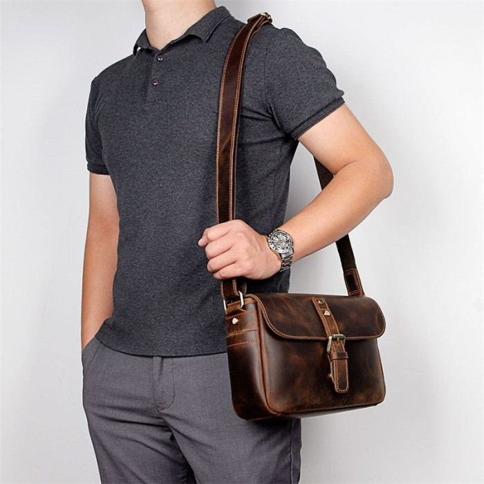 Стильний месенджер виготовлений із натуральної шкіри, виробника John McDee. Оригінальний аксесуар для повсякденного використання. Ця модель має одне загальне відділення, яке приховано під клапаном. Також є відкрита кишеня (під клапаном), всередині виробу присутня одна врізна кишеня на блискавці і дві відкриті кишені, для дрібних предметів. Сумка має регульований ремінець (шкіра + текстиль), що дуже зручно при використанні.