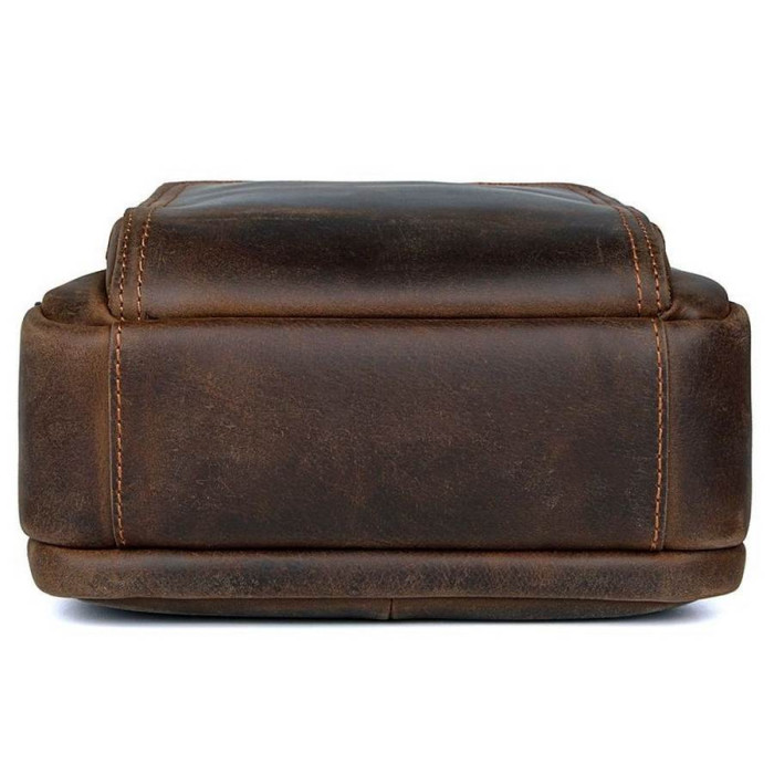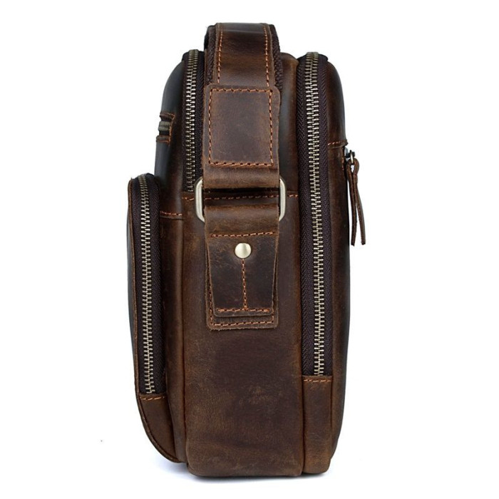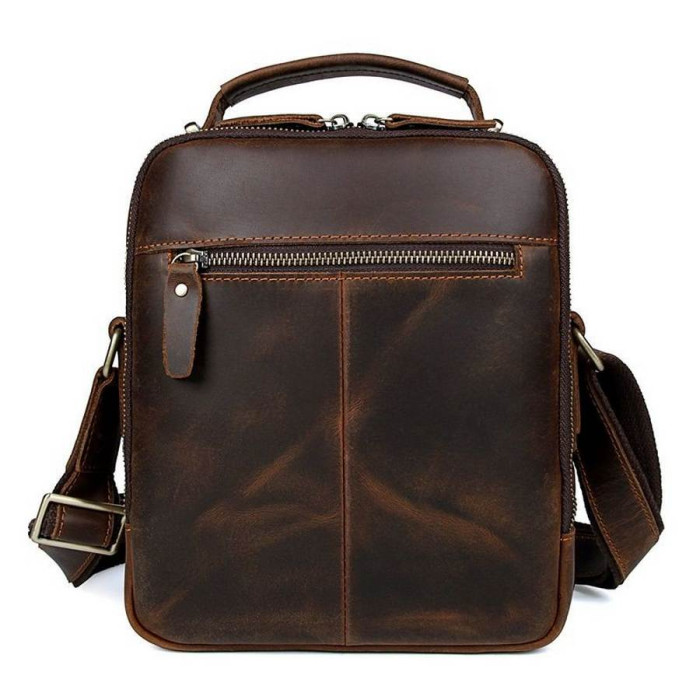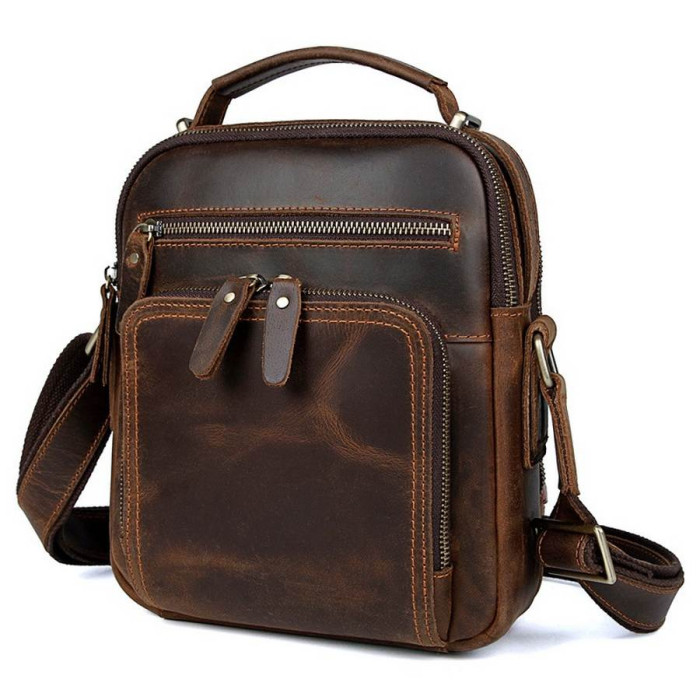 Цікава чоловіча сумка через плече і з маленькою ручкою зверху JD1063R, бренду John McDee. Виріб виконаний з натуральної кінської шкіри. Має два відділення, що застібаються кожне на окрему блискавку. Всередині є врізний кишеню з блискавкою і відкритий для телефону. Лицьову сторону вигідно доповнює дуже зручний накладна кишеня відкидного типу з блискавкою, і поруч врізний кишеню. Також, є врізна кишеня на задній стороні сумки. Аксесуар наділений шкіряним наплічним ременем з регулюванням довжини.