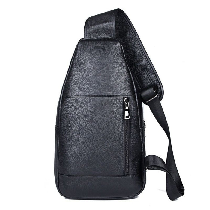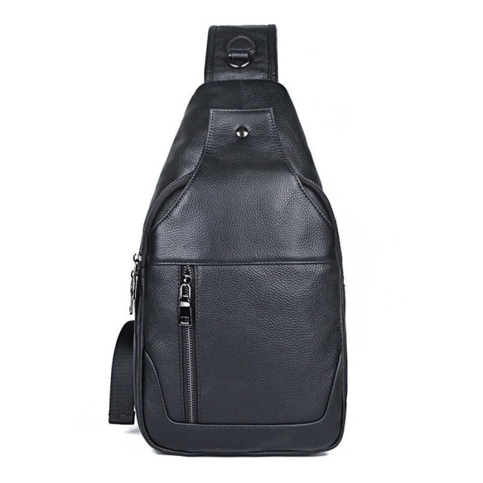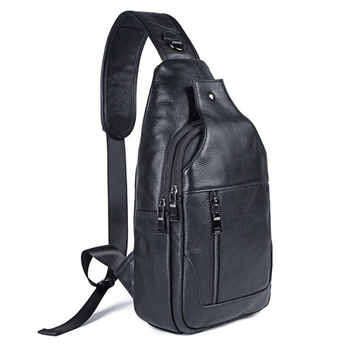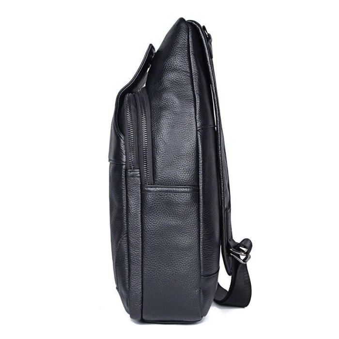 Рюкзак на одне плече великого розміру для чоловіків JD4004LA для повсякденного носіння. Виготовлений з телячої натуральної шкіри чорного кольору. Рюкзак має два основних відділення на блискавках, в одному з відділень розташований накладна кишеня. На лицьовій і задній сторонах рюкзака - вертикальні врізні кишені на блискавках. Додатково застібається на магнітну кнопку. Вільно регульований ремінь. Усередині міцна міцна тканина.