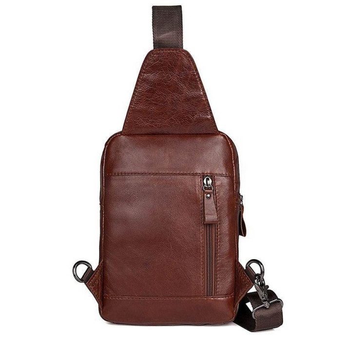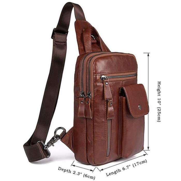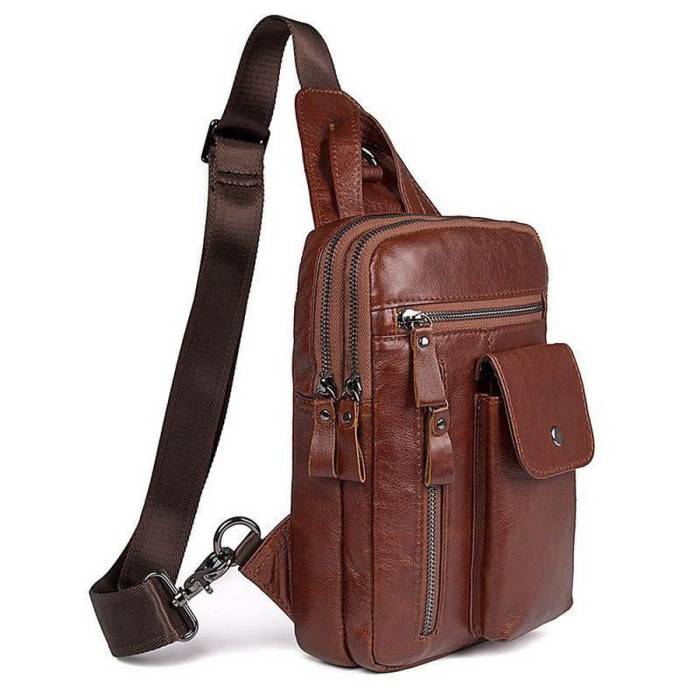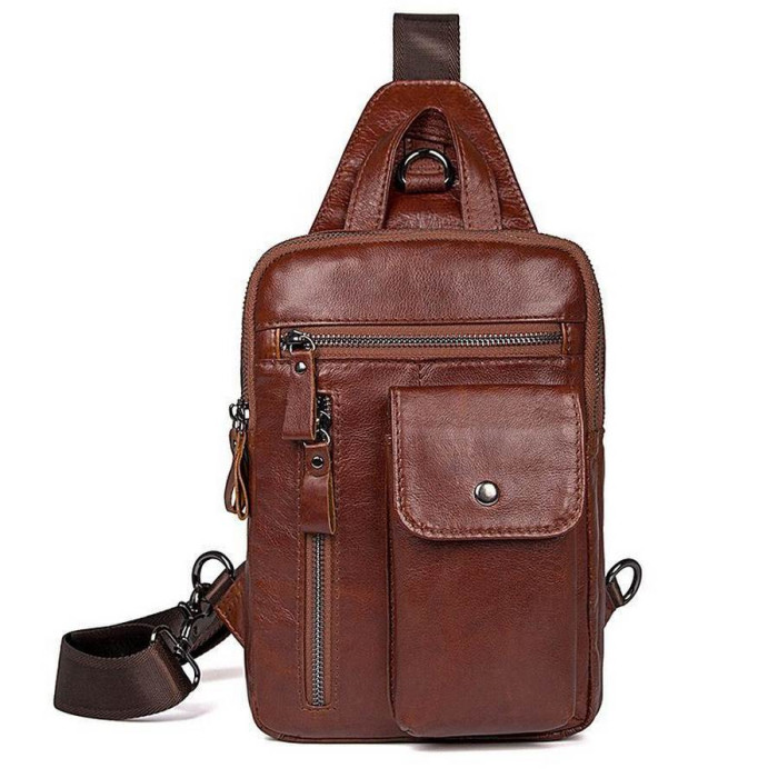 Чоловіча невелика, містка і компактна сумка на плече з натуральної м'якої телячої шкіри. Складається з двох роздільних відділень на блискавки і безлічі кишеньок для дрібниць і телефону. З лицьового боку сумки один накладна кишеня і два внутрішніх на блискавки. З внутрішньої один кишенька на блискавці. Для зручності у верхній частині сумки знаходиться ручка.