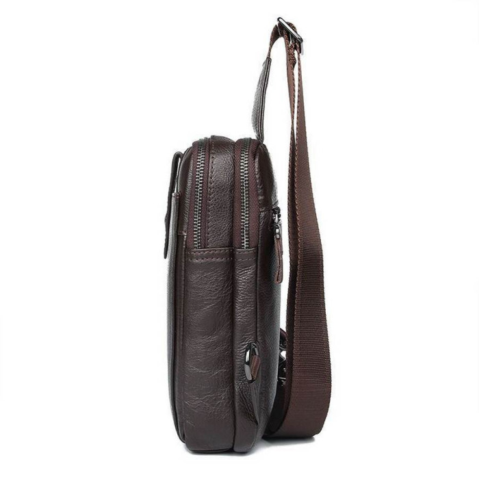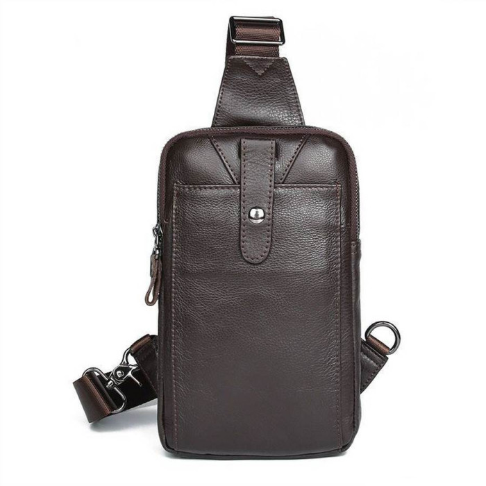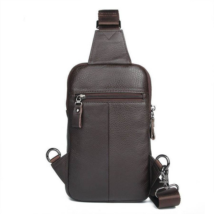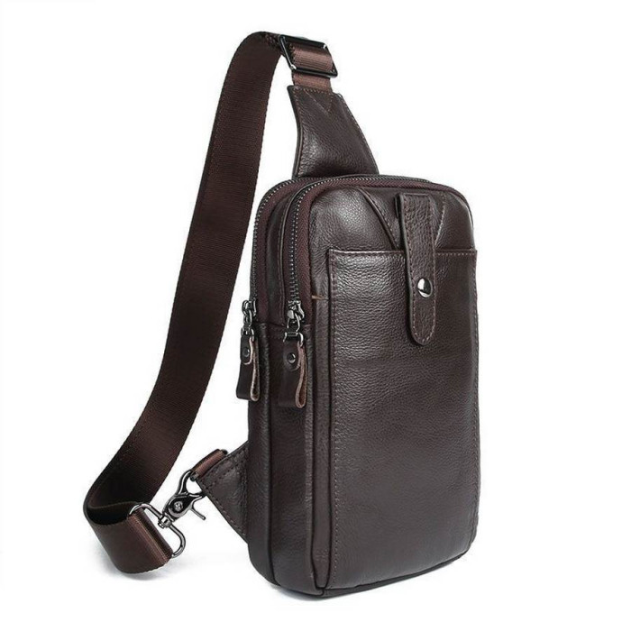 Міні-рюкзак чоловічий на одне плече JD4018С виготовлений з натуральної телячої шкіри флотар. Колір коричневий. Модель рюкзака має лаконічну прямокутну форму з ременем через плече. Моношлейка - міцна, текстильна, регулюється по довжині. На лицьовій частині рюкзака є накладної кишені в стриманому стилі на магнітній кнопці. З тильного (задньої) сторони є врізна кишеня на блискавці для цінних речей. Рюкзак має два відділення на блискавках. Всередині одного з цих відділень - кишеня-відсік з обробкою з шкіри чорного кольору. Фурнітура вироби - фірмова. Застібки і блискавки - якісні та надійні. Внутрішнє оздоблення - високоякісний текстиль.