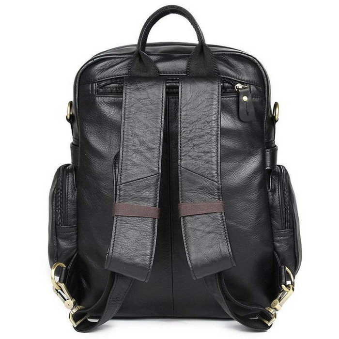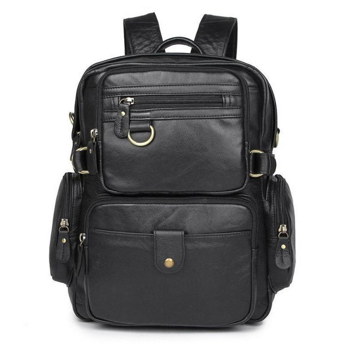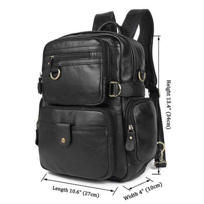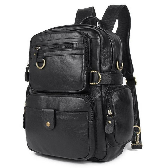 Чоловік рюкзак JD7042A з натуральної шкіри. Повсякденний аксесуар-трансформер 2в1: в спеціальних кишеньках у верхній частині вироби можна ховати шлейки рюкзака, а з боків прикріпити довгий ремінь для носіння на плечі як сумку. Дана модель має різні за розміром кишені, як спереду, так і з боків. Кожен відрізняється індивідуальним дизайном, декоративної фурнітурою. Містке основне відділення поміщає папки з документами, гаджети. Каркасна модель.