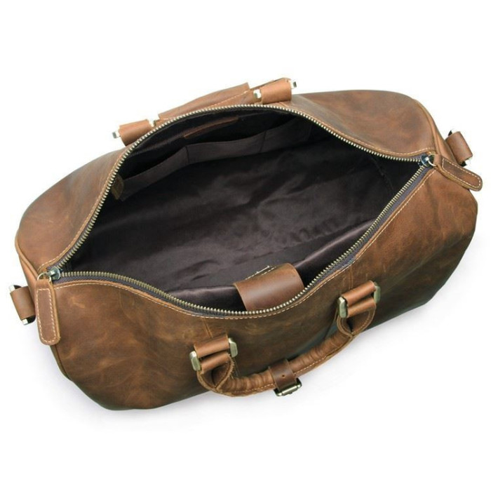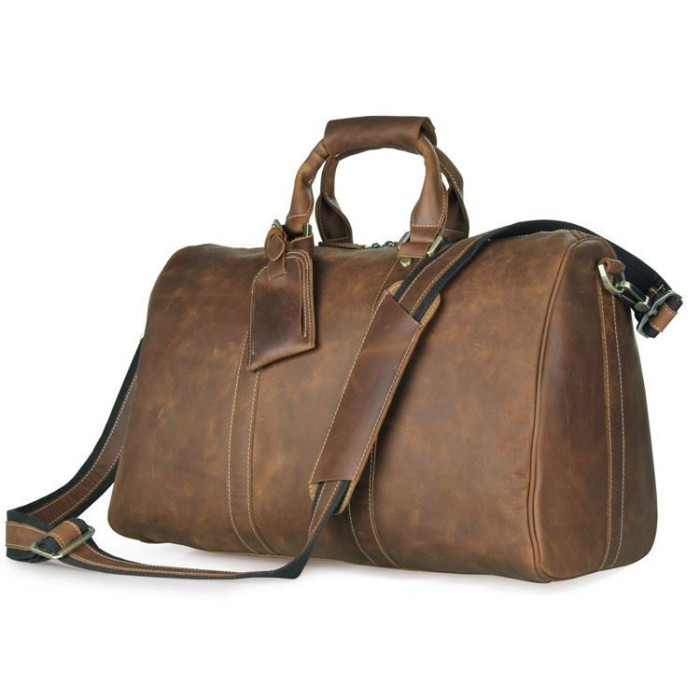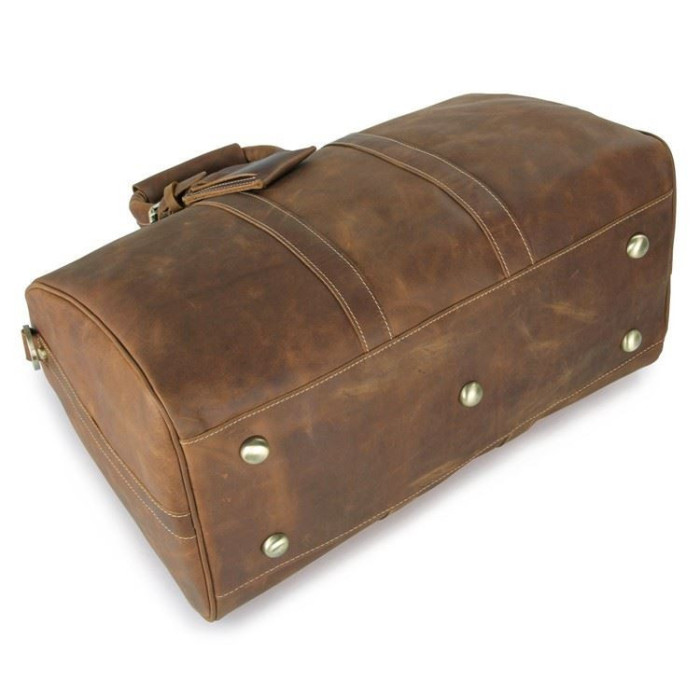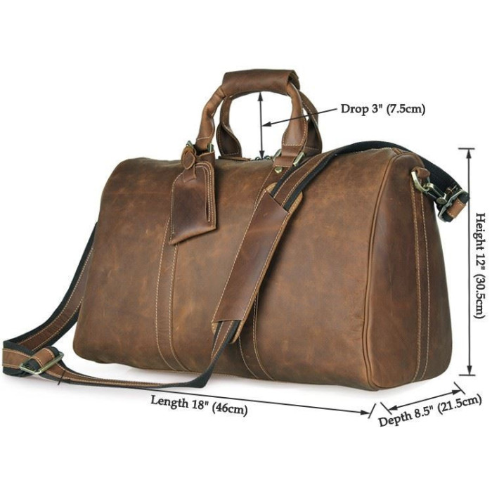 Велика вінтажна дорожня сумка з кінської шкіри. У виробі використана фурнітура кольору латуні. Внутрішнє оздоблення сумки: міцна тканина. Сумка має жорстке укріплене дно на п'яти металевих ніжках для захисту шкіри від пошкоджень. Усередині виріб має одне велике основне відділення, відділення для ноутбука 15 ", що застібається ремінцем на липучці, а також 3 кишені для телефону, документів, портмоне і велика кишеня на блискавці. Місткий стильний дорожній аксесуар, тревелбег з 100% натуральної шкіри. Комфортні для носіння посилені шкіряні ручки на металевих кільцях з додатковим ремінцем на двох металевих кнопках, який фіксує ручки разом. Посилений, знімний ремінь на плече з регульованою довжиною, двосторонній (натуральна шкіра + текстиль). Додатково - знімна бирка для багажу на шкіряному ремінці кріпиться на ручку сумки.