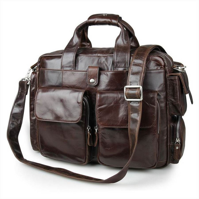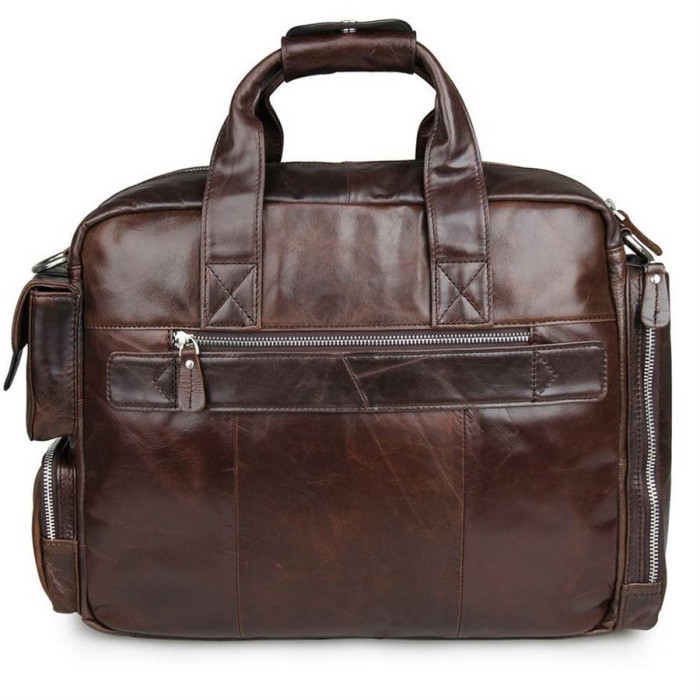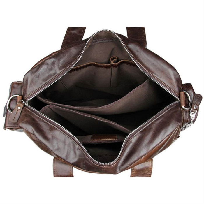 Відмінна і надійна шкіряна сумка 2 в 1 фабричного бренду John McDee виготовлена з натуральної телячої шкіри коричневого кольору високої якості, має високоякісну обробку і стильний двосторонній дизайн. Оригінальна глянсова забарвлення і відлив шкіри надає стильність і дорогий вид виробу. Сумка містка, має безліч відділень і підійде для щоденного використання, як в офісі, так і в подорожах.