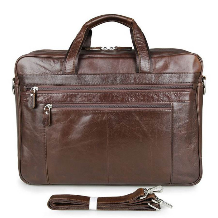 Представлена моделька портфеля з натуральної шкіри JD7319C володіє понад місткістю, адже вона оснащена двома великими внутрішніми відділеннями на блискавках. Туди легко помістяться різного типу особисті речі, документи, гаджети і навіть ноутбук.