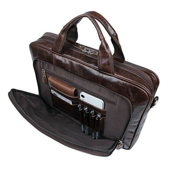 - На фронтальній (лицьовій) частинисумки великий місткий накладна кишеня на двосторонній блискавки. Усередині накладного кишені є шкіряні кишені - відсіки для канцтоварів, мобільного телефону, планшета, візиток, кредитних карт, портмоне і т.д. З задньої (тильної) сторони сумки великий прорізна кишеня на блискавці, а нижче декоративний і функціональний ремінь - клапан для кріплення на дорожніх ручках сумок і валіз (більш детально див. Фото). Сумка має одне велике, практичне і містке відділення для документів, книг або ноутбука.
