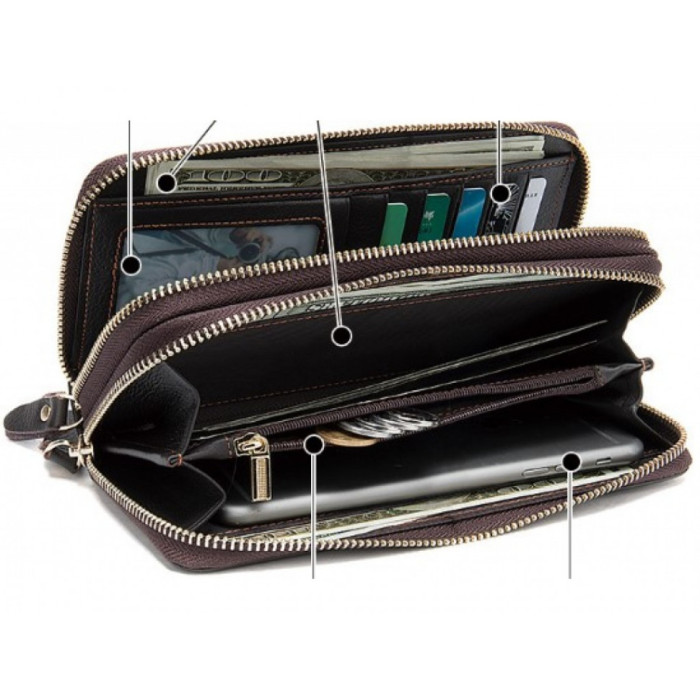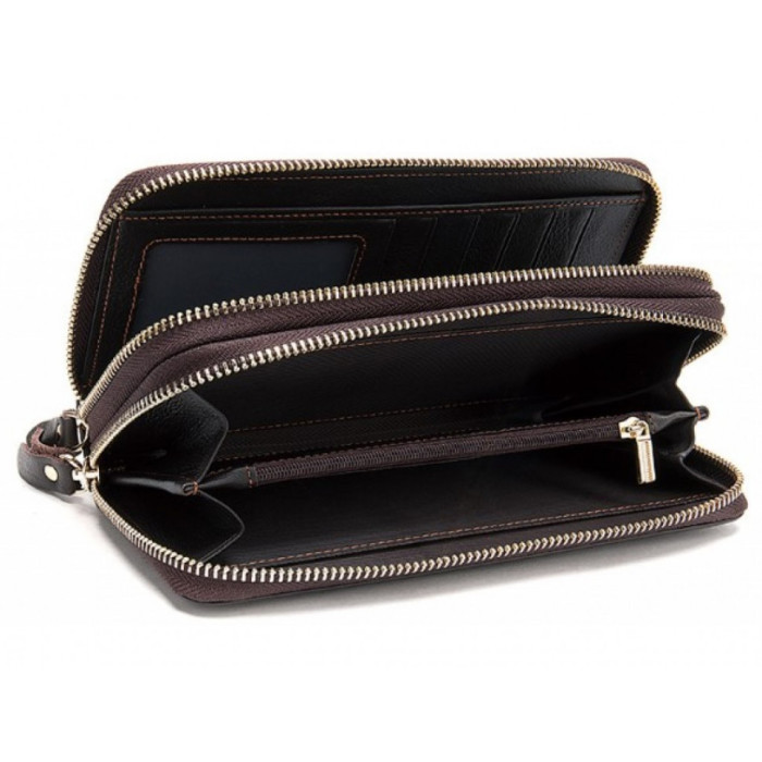 Внутрішня частина товару закривається металевою блискавкою. Усередині є два відділення, які розділені кишенькою-перегородкою на блискавці. На кожній із внутрішніх стінок клатчу є органайзери для кредитних карток. Всередину, в будь-якому відділенні можна зберігати готівку, смартфон. У кишеньці-перегородці - дрібниця.