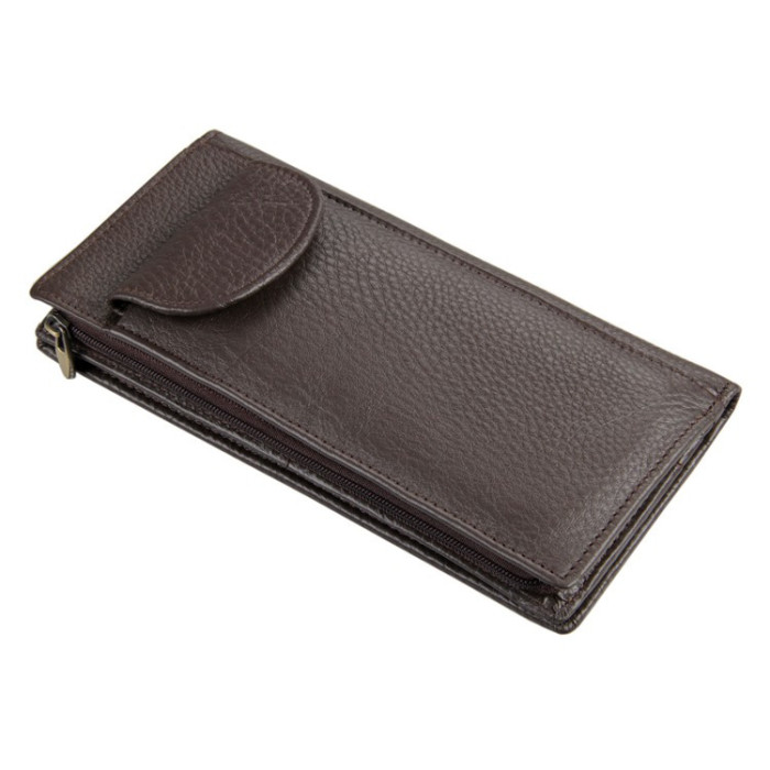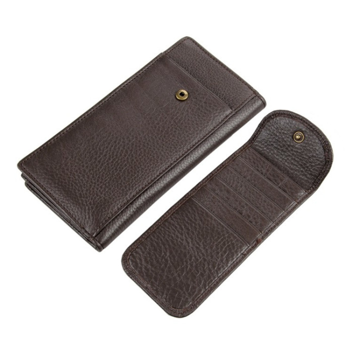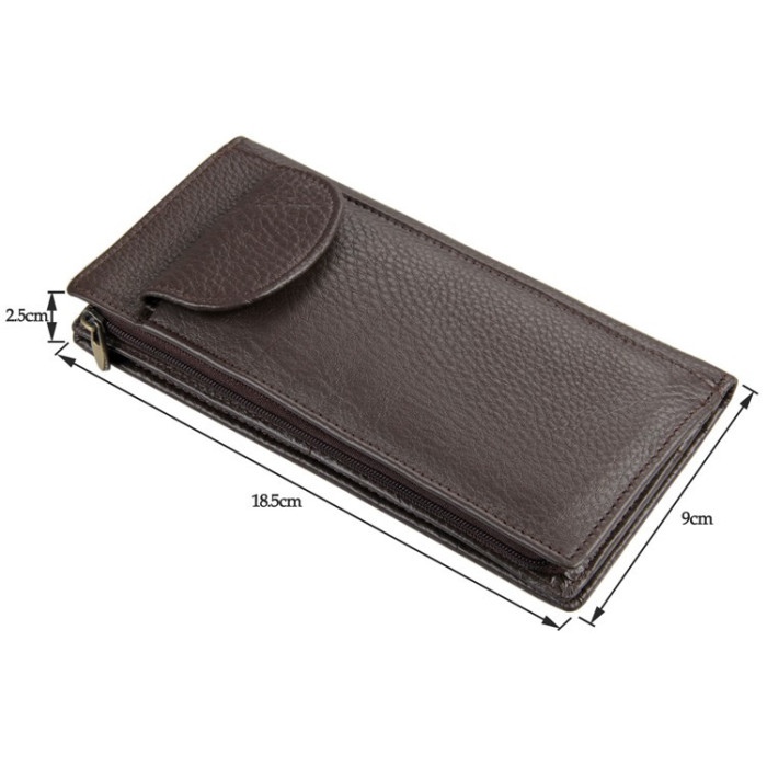 Стильний шкіряний гаманець кардхолдер John McDee JD8065C - перевершує будь-які очікування. Текстуірованная теляча шкіра що ще в порівнянні з функціональним дизайном, акуратною рядком і ергономічними розмірами гаманця. Металеву фурнітуру представляє єдина змійка, що відкриває головний кишеню і магнітна кнопка знімного слота під банківські карти. Паперові купюри зберігаються в горизонтальному положенні, не мнуться навпіл. Всередині є 9 відсіків під пластикові карти, sim і sd, а також мініатюрна візитниця. Перевагою моделі виступає можливість переносити без чохла смартфон з діагоналлю екрану до 7.2 дюйма, в тому числі яблучний iPhone. Для цього виділено спеціальний вертикальний кишеню з маленьким клапаном, який кріпиться до самого гаманцю.