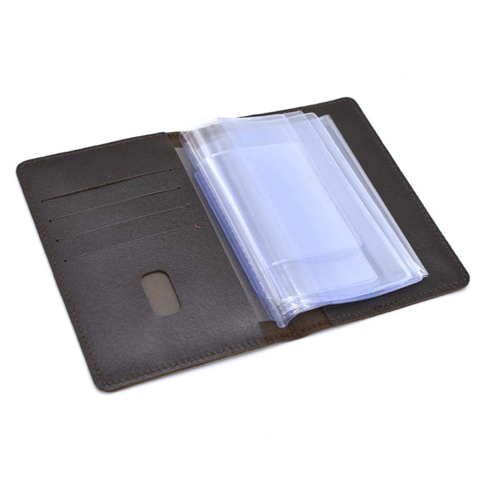 Функціональна та містка обкладинка для автодокументів, банківських карток, ID паспорта, довіреності, ОСАЦВ, КАСКО та інших документів. Обкладинка виконана з натуральної шкіри з прозорими вкладишами посередині. Вкладиш складається з 4 прозорих кишень під картки та одного великого прозорого файлу формату А5 для полісу КАСКО, ОСАГО, Грін Кард та інших документів такого формату. На лівій внутрішній стороні обкладинки для документів водія LIMARY чотири слоти для банківських карт, техпаспорти, прав (картка) і т.п. На правій стороні один таємний слот для картки стандартного формату.