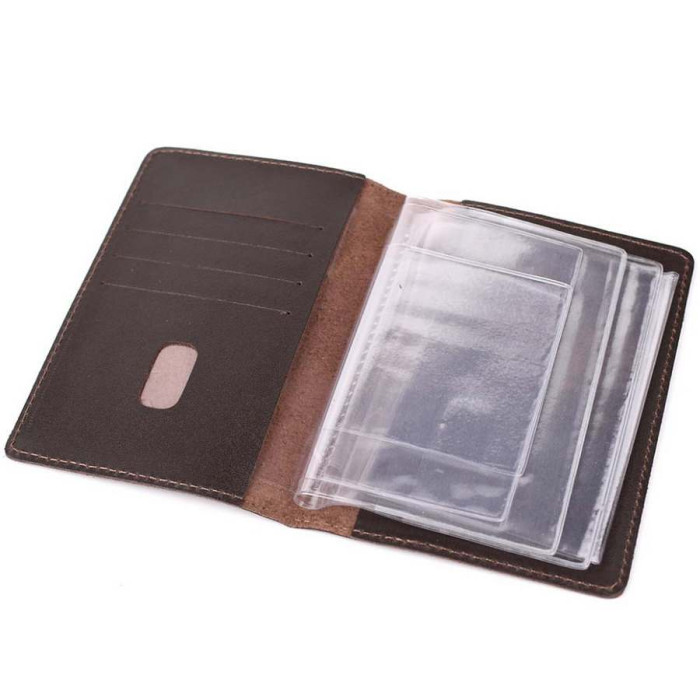 Функціональна та містка обкладинка для автодокументів, банківських карток, ID паспорта, довіреності, ОСАЦВ, КАСКО та інших документів. Обкладинка виконана з натуральної шкіри з прозорими вкладишами посередині. Вкладиш складається з 4 прозорих кишень під картки та одного великого прозорого файлу формату А5 для полісу КАСКО, ОСАГО, Грін Кард та інших документів такого формату. На лівій внутрішній стороні обкладинки для документів водія LIMARY чотири слоти для банківських карт, техпаспорти, прав (картка) і т.п. На правій стороні один таємний слот для картки стандартного формату.