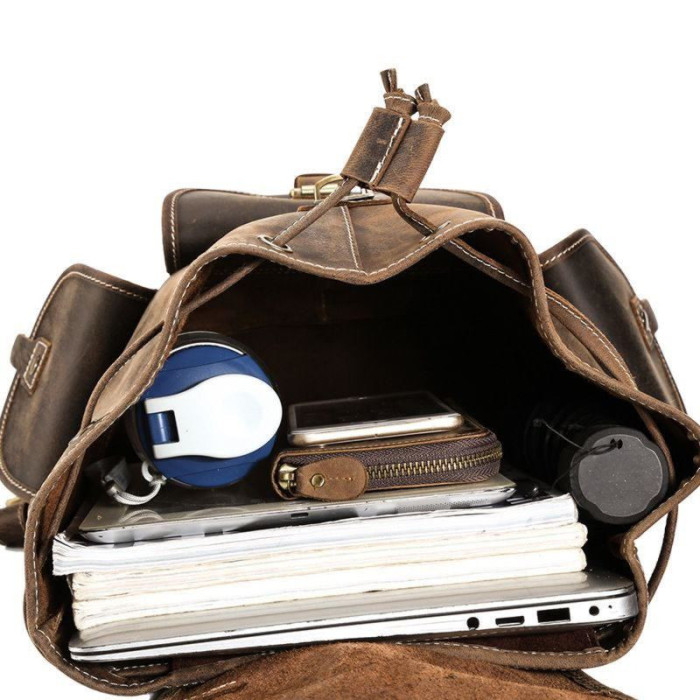 Шкіряний рюкзак має оригінальний дизайн і розташування кишень, що робить його особливо цікавим і зручним. Кожен з кишень застібається окремо. Виріб вгорі затягується шкіряним шнуром, а також додатково застібається на замок. Всередині одне велике відділення і кишенька на блискавці. Може використовуватися для спорту.