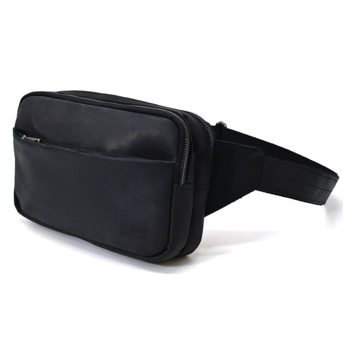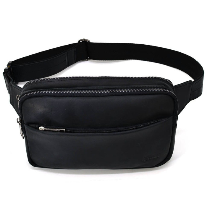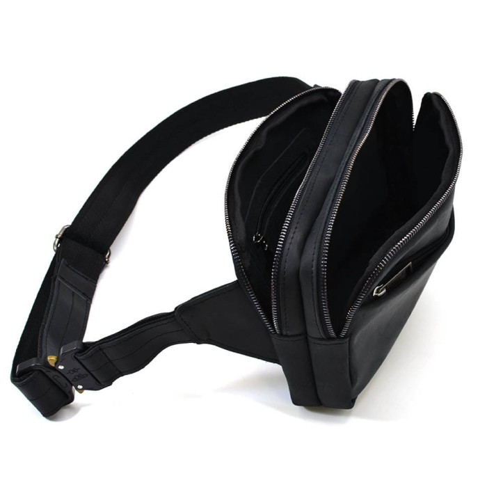 Від українського виробника TARWA. Стильний аксесуар на кожен день, у поїздці та на прогулянці. Сумка складається з двох окремих великих відділень, що застібаються на блискавці. Зовнішній бік доповнює кишеню практично на всю лицьову поверхню, що також застібається на блискавку. На задній стороні є врізна кишеня. Ремінь виконаний повністю зі шкіри із текстильною основою. Застібка (фастекс) металева та надійна. Текстильна міцна підкладка. Ця модель є збільшеною версією сумки RA-0704-3md. Шкіра - матова чорна, колір блискавки - чорний