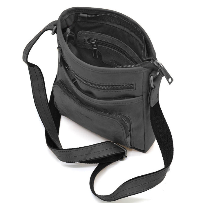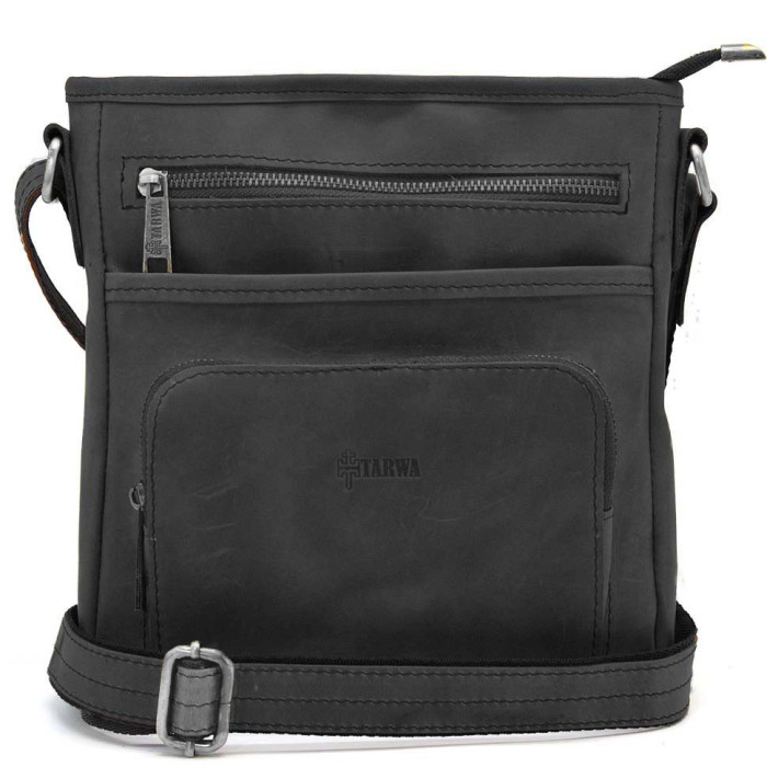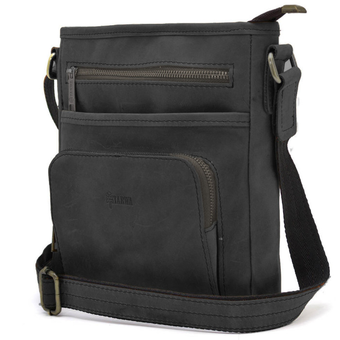 Чоловічі шкіряні сумки з кишенею RA-1303-3md TARWA з кишенею чорна з кінської шкіри крейзі хорс від українського бренду TARWA. Виріб на одне відділення, яке застібається на блискавку. Може вміщувати планшет. Усередині є кишені для дрібних особистих речей: дві відкриті накладні і одна врізна на блискавці. На обох зовнішніх сторонах аксесуара розташовуються кишені на блискавці. У виробі використано міцну тканинну підкладку. Сумочку можна носити на плечі завдяки зручному плечовому шкіряному ременю, що регулюється. Блискавка -темний нікель