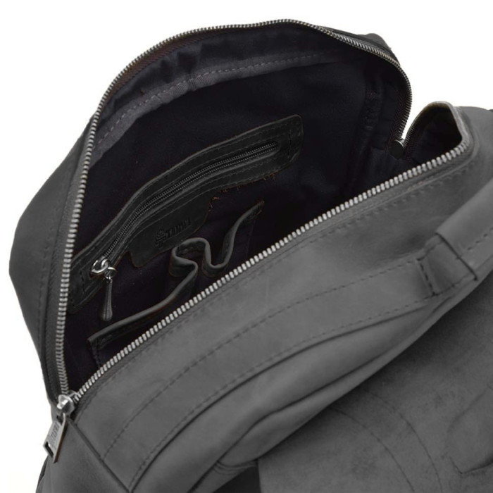 Усередині сумки-рюкзака зі шкіри 3420 від ТАРВА багате наповнення. Кишеня для ноутбука на липучці, кишеня на блискавці для важливих документів, дві відкриті кишені зі шкіряними торцями для довговічності.